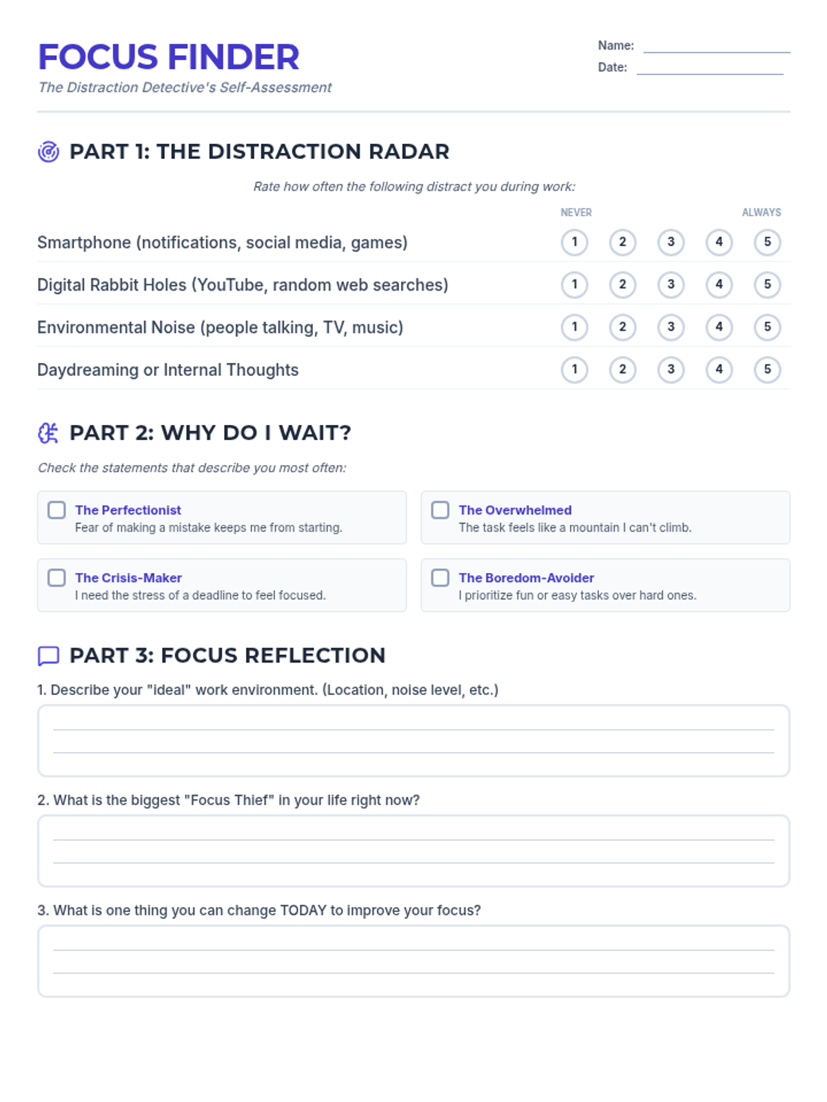 A self-reflection assessment designed to help students identify their primary distractions and the underlying causes of their procrastination. It uses a 'detective' theme to encourage honest introspection about focus habits.