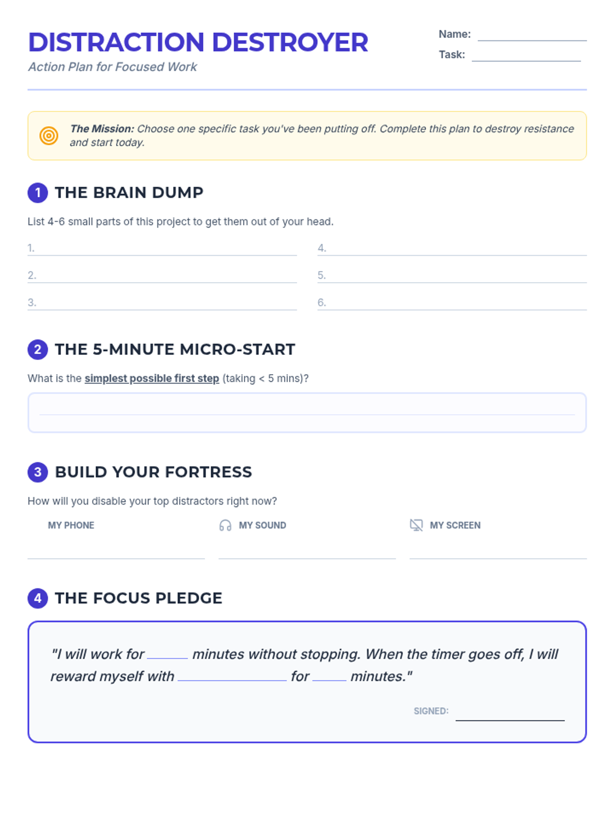 A practical worksheet that guides students through a series of actionable steps to overcome procrastination on a specific task. It includes a 'brain dump' section, a micro-start strategy, and a 'Fortress of Solitude' plan for environment control.