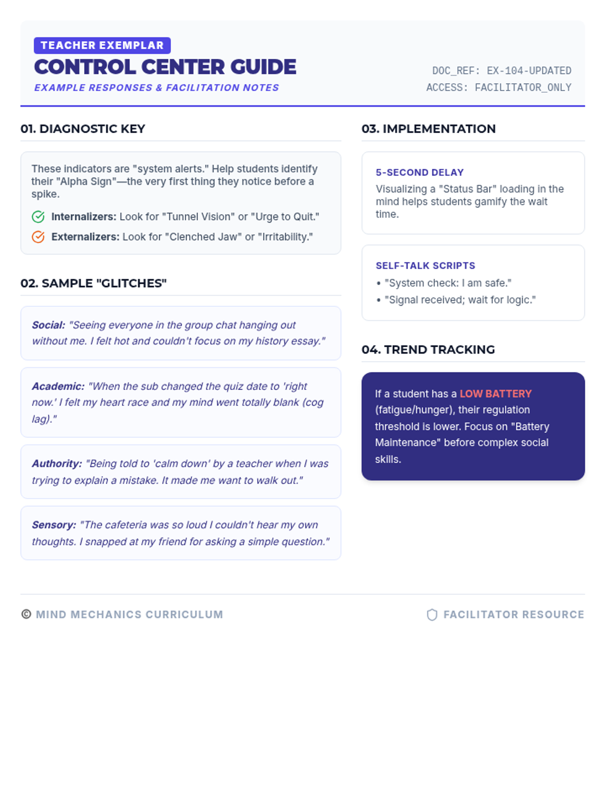 An updated teacher exemplar for the Control Center worksheet, providing varied sample student responses across Social, Academic, Authority, and Sensory triggers. Includes facilitation tips for interpreting student data and supporting regulation.