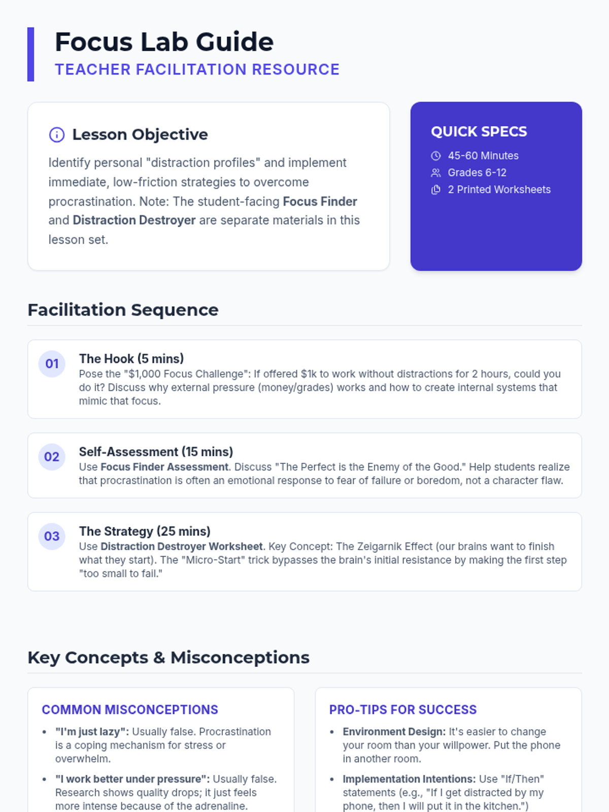 A comprehensive teacher's guide for facilitating the 'Focus Lab' lesson. It includes a hook activity, step-by-step facilitation instructions, pedagogical tips on procrastination, and key vocabulary terms.