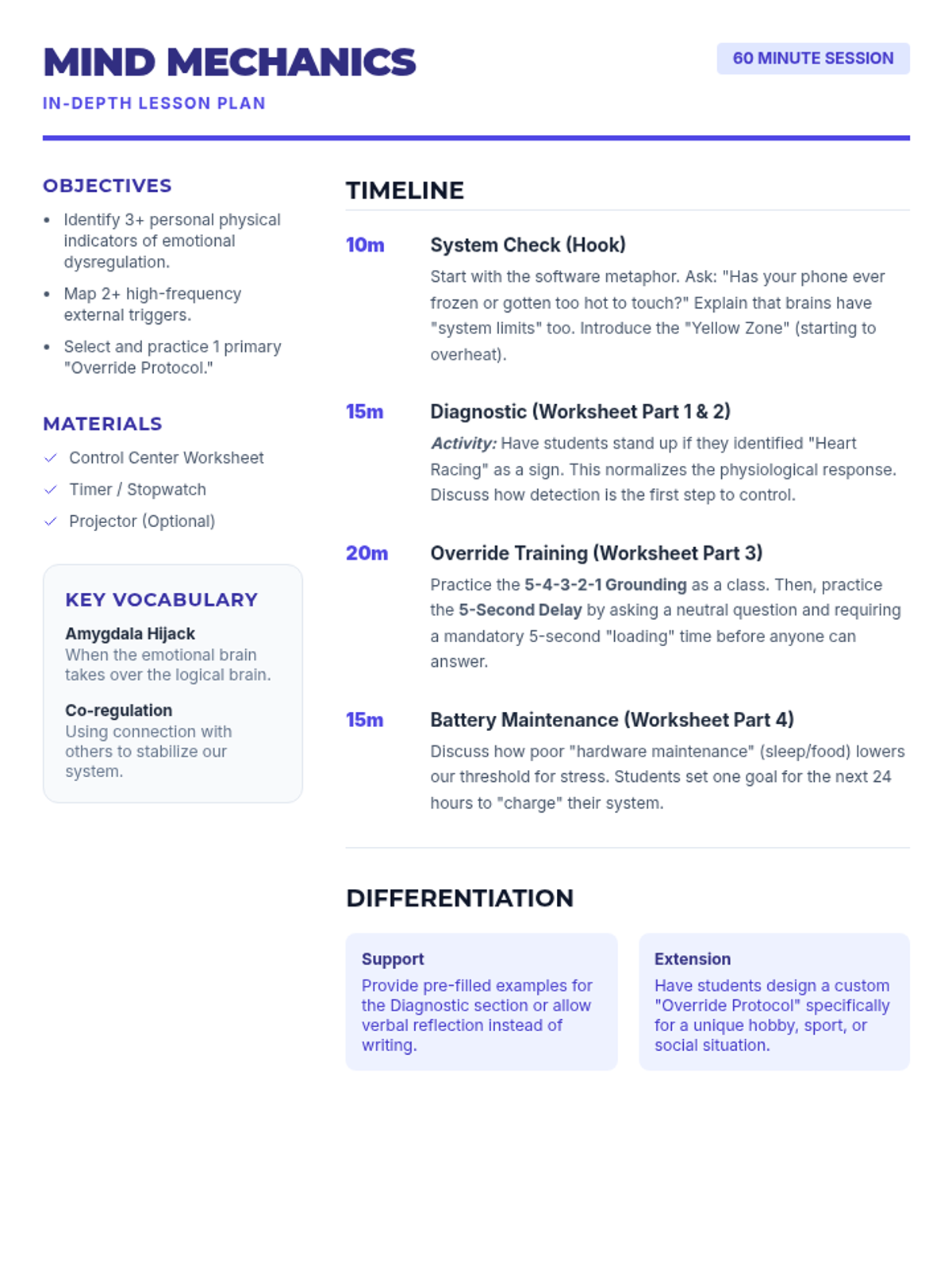 A detailed lesson plan for the Mind Mechanics session, featuring a 60-minute timeline, learning objectives, materials list, vocabulary support, and differentiation strategies. It complements the student worksheet and quick-start guide.