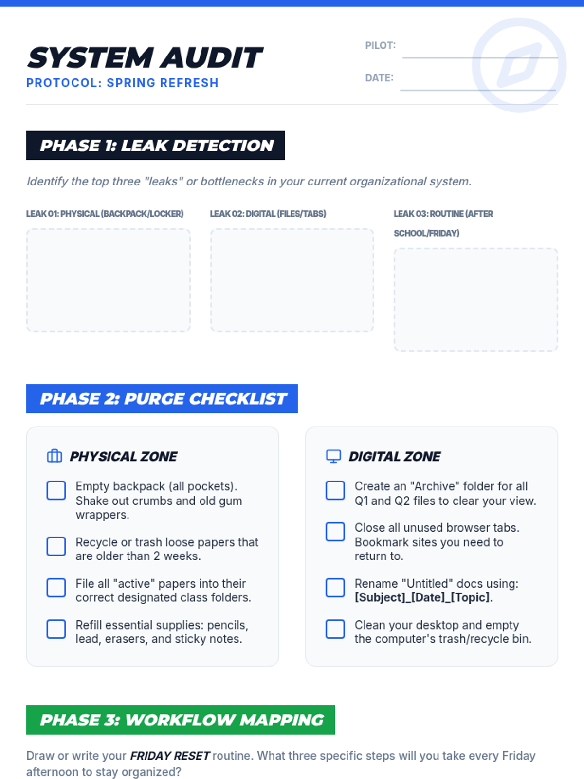 The final, ink-optimized version of the System Reset Protocol handout. Revised for exactly two pages with "Maximum Scale" logic: writing areas, headings, and margins have been significantly enlarged to fill the page more completely and improve usability. Features an ink-saving light green Exit Ticket and spacious, dashed writing lines. Corrected balance across two pages.