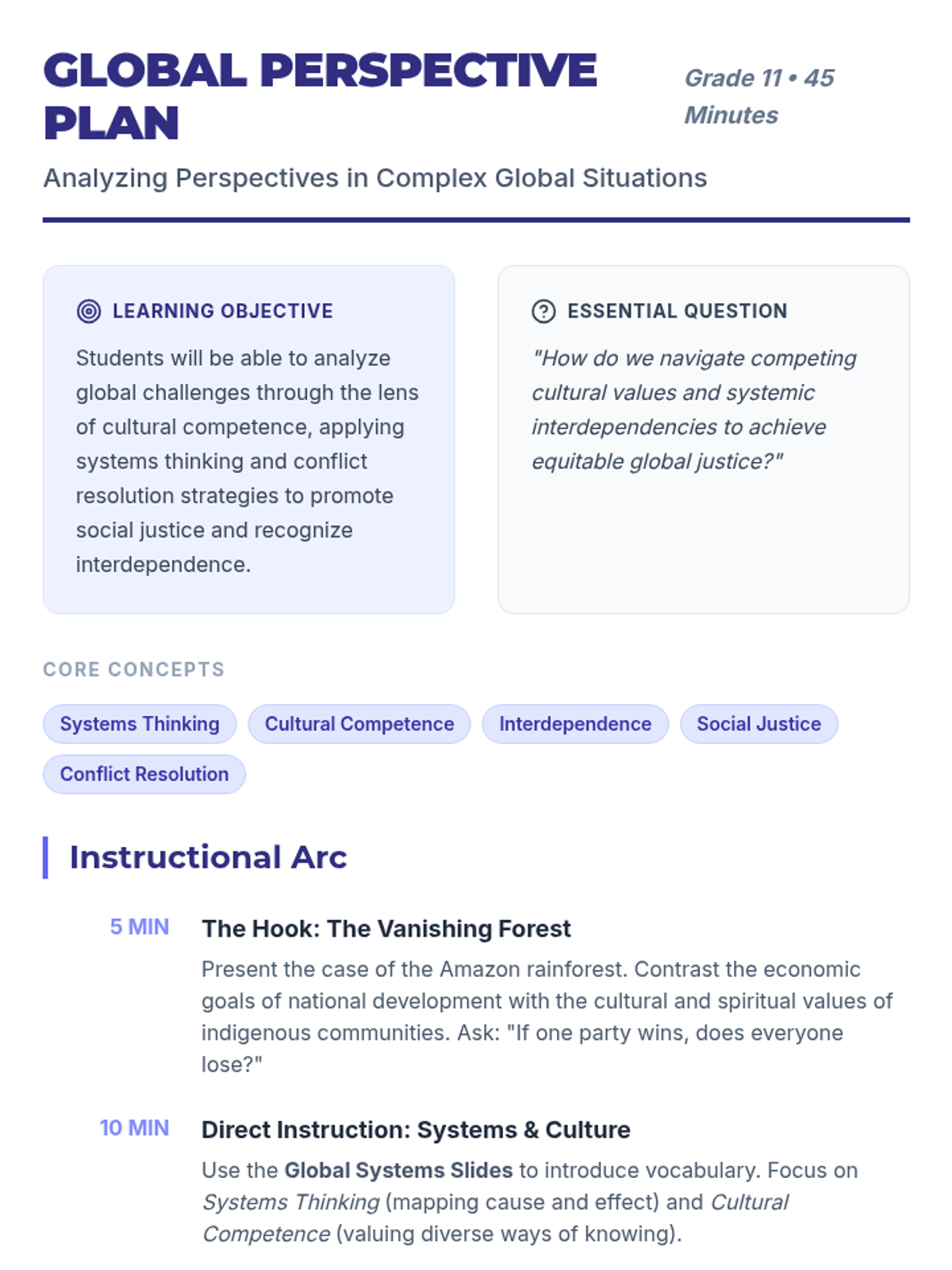 A detailed 45-minute lesson plan for 11th-grade students focused on global interdependence, systems thinking, and cultural competence.