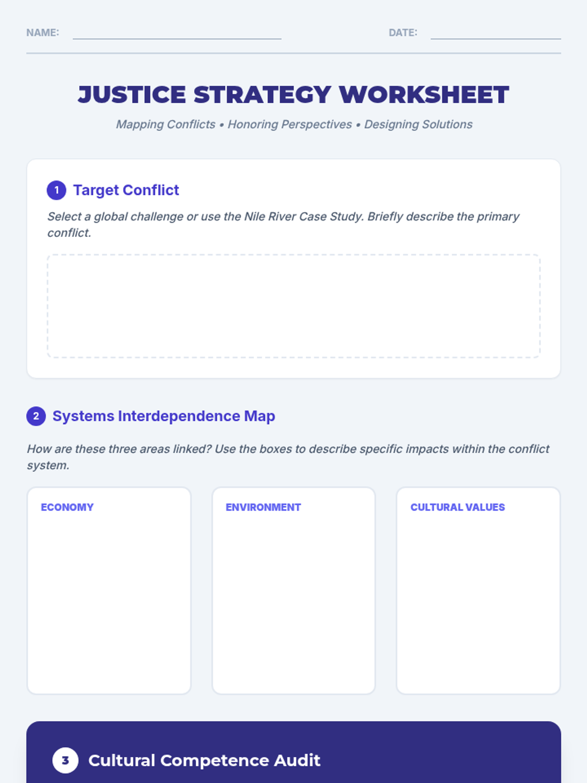 A scaffolded student worksheet for drafting conflict resolution strategies using systems thinking and cultural competence.