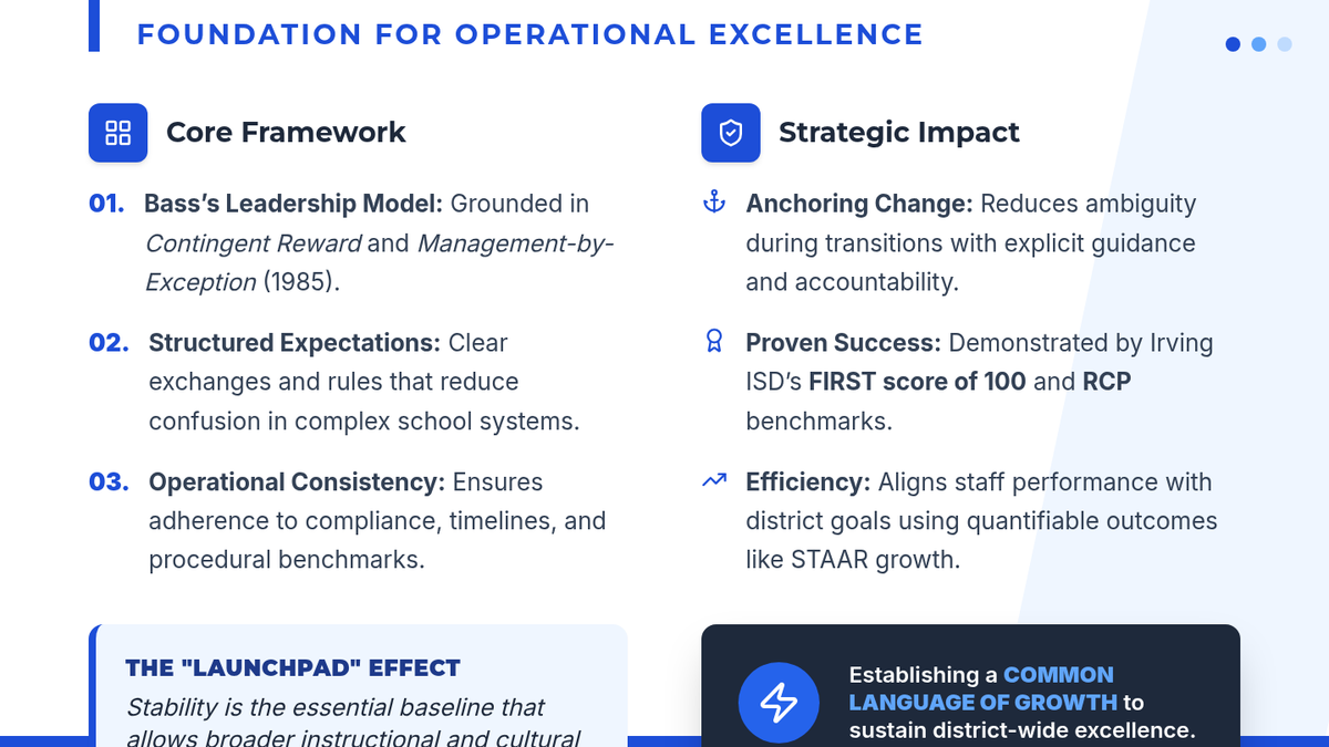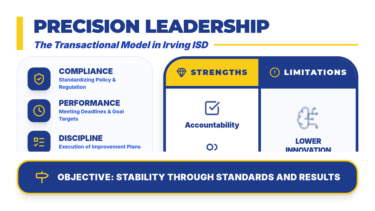 A high-impact, single-slide presentation summarizing the mechanism, research, and Irving ISD application of transactional leadership.