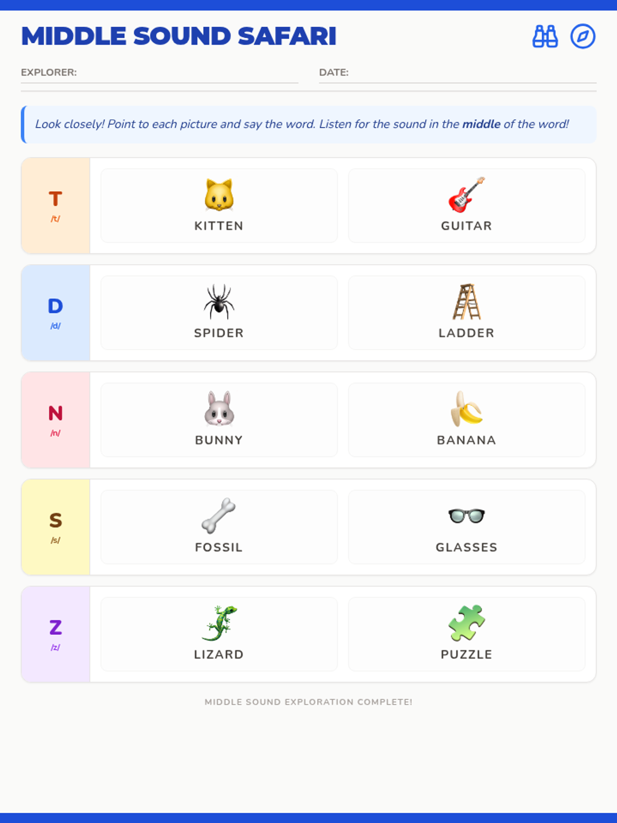 A visual articulation practice worksheet for kindergarteners featuring 2 pictures for each sound (t, d, n, s, z) in the word-medial position with a blue explorer theme.