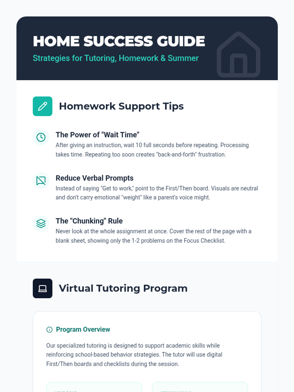 A comprehensive guide for parents providing practical homework tips, details on the virtual tutoring program, and a worksheet for planning summer routines to maintain student progress.
