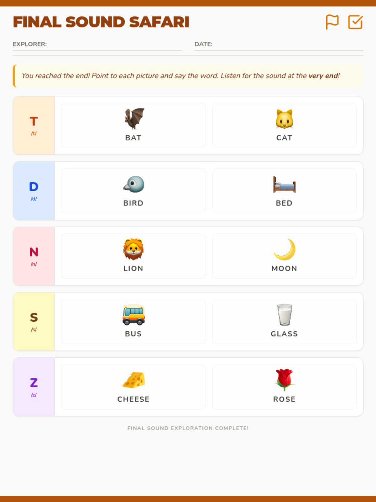 A visual articulation practice worksheet for kindergarteners featuring 2 pictures for each sound (t, d, n, s, z) in the word-final position with an amber adventure theme.