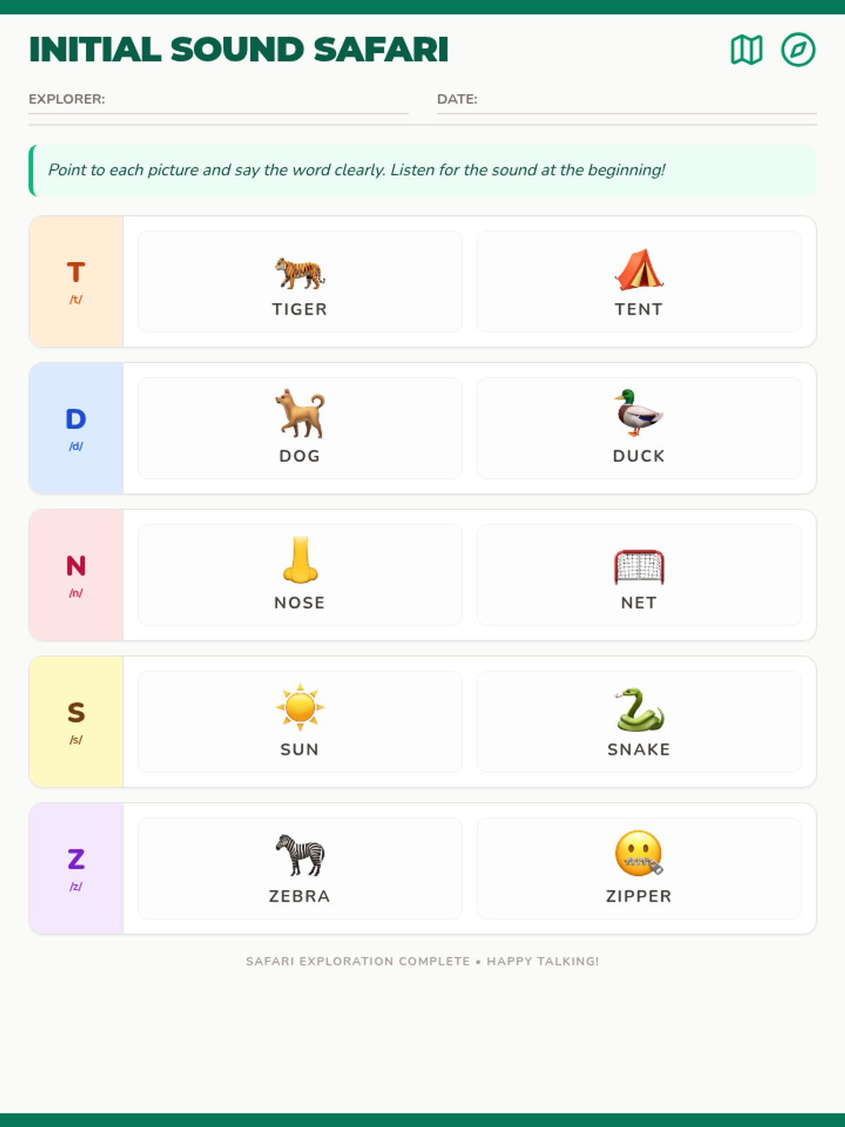 A visual articulation practice worksheet for kindergarteners featuring 2 pictures for each sound (t, d, n, s, z) in the word-initial position with a fun safari theme.
