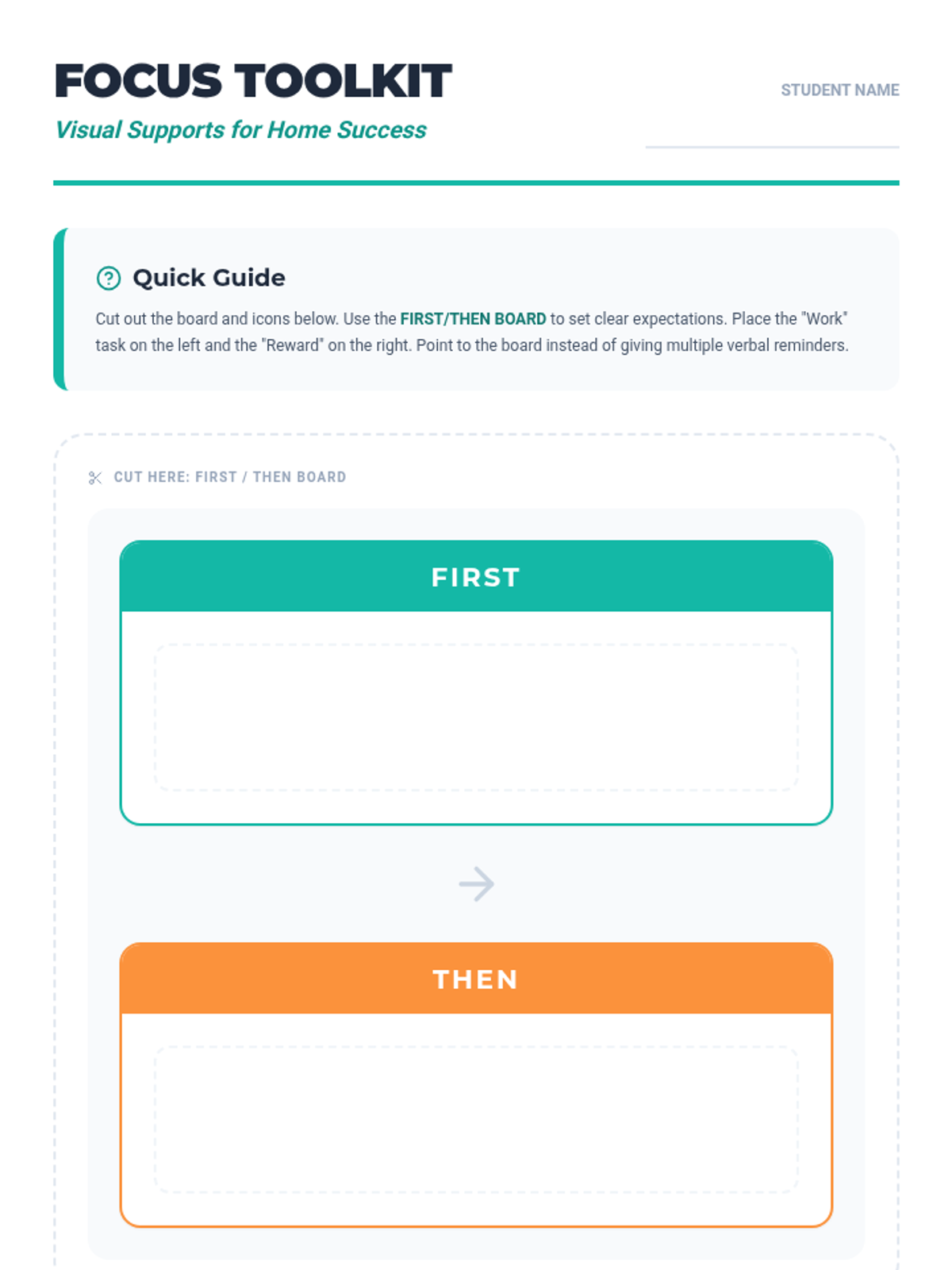 A printable toolkit for parents featuring a customizable First/Then board, visual icons, and focus checklists to support task initiation and independent work at home.