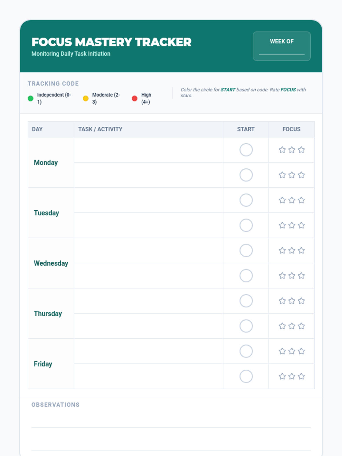 A weekly tracking sheet for parents to monitor task initiation and sustained focus, using a simple color-coded system and star ratings to record student progress.