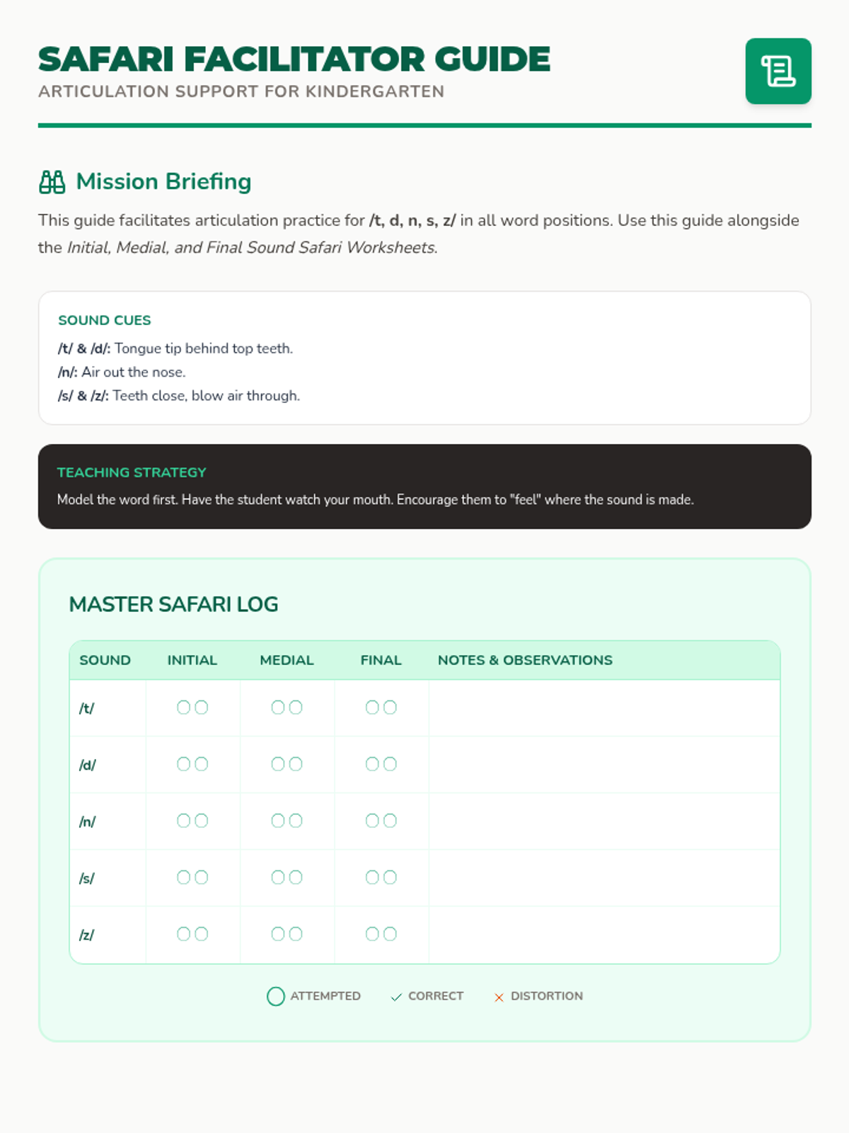 A comprehensive facilitator guide for tracking articulation progress across initial, medial, and final word positions for /t, d, n, s, z/.