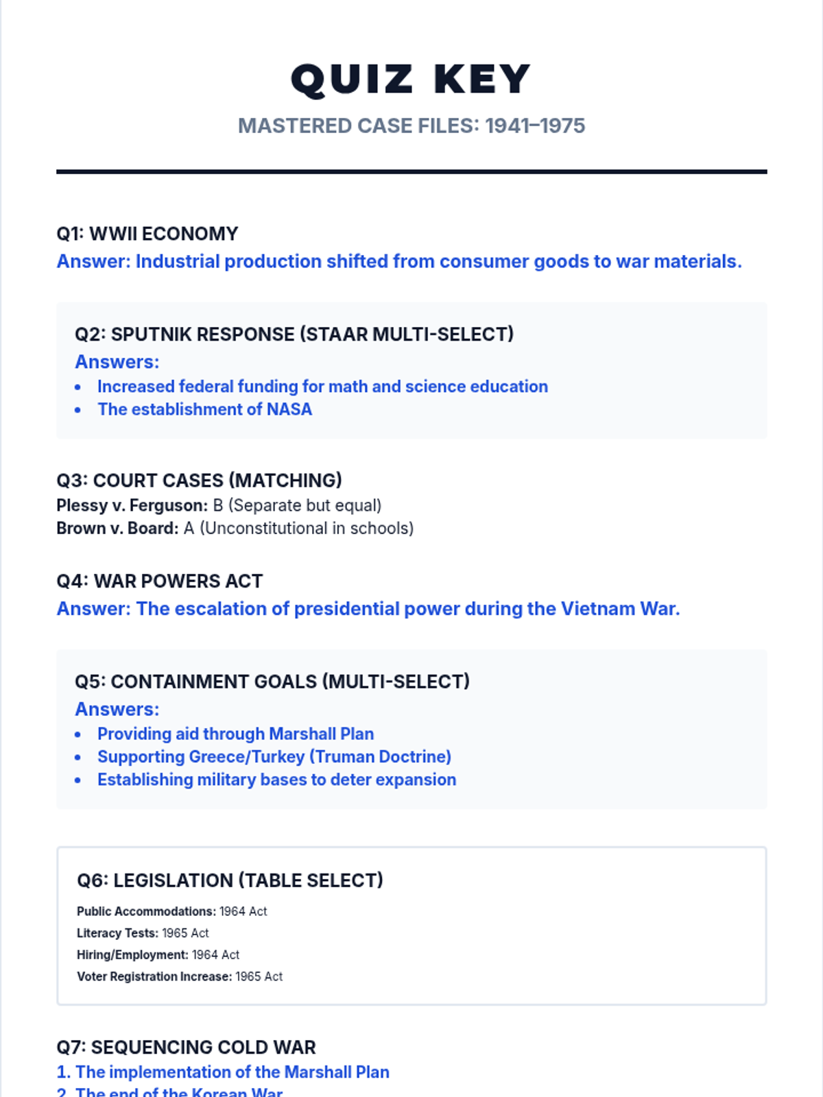 Comprehensive answer key for the Final Mastery Quiz, detailing correct answers for all 10 STAAR 2.0-style questions.