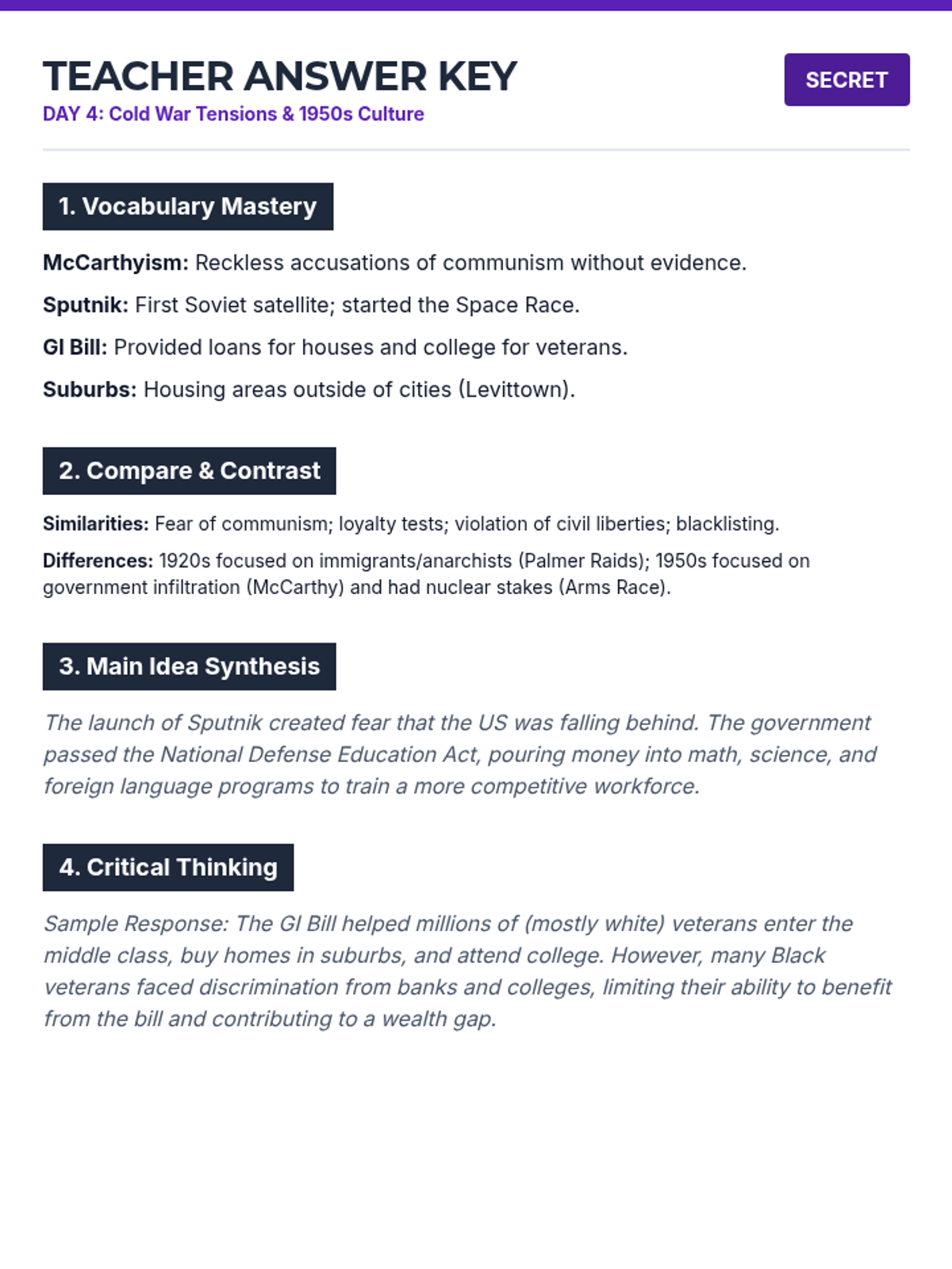 Teacher answer key for Day 4 remediation packet, featuring McCarthyism, Space Race, and 1950s cultural shifts with comparison and contrast answers.