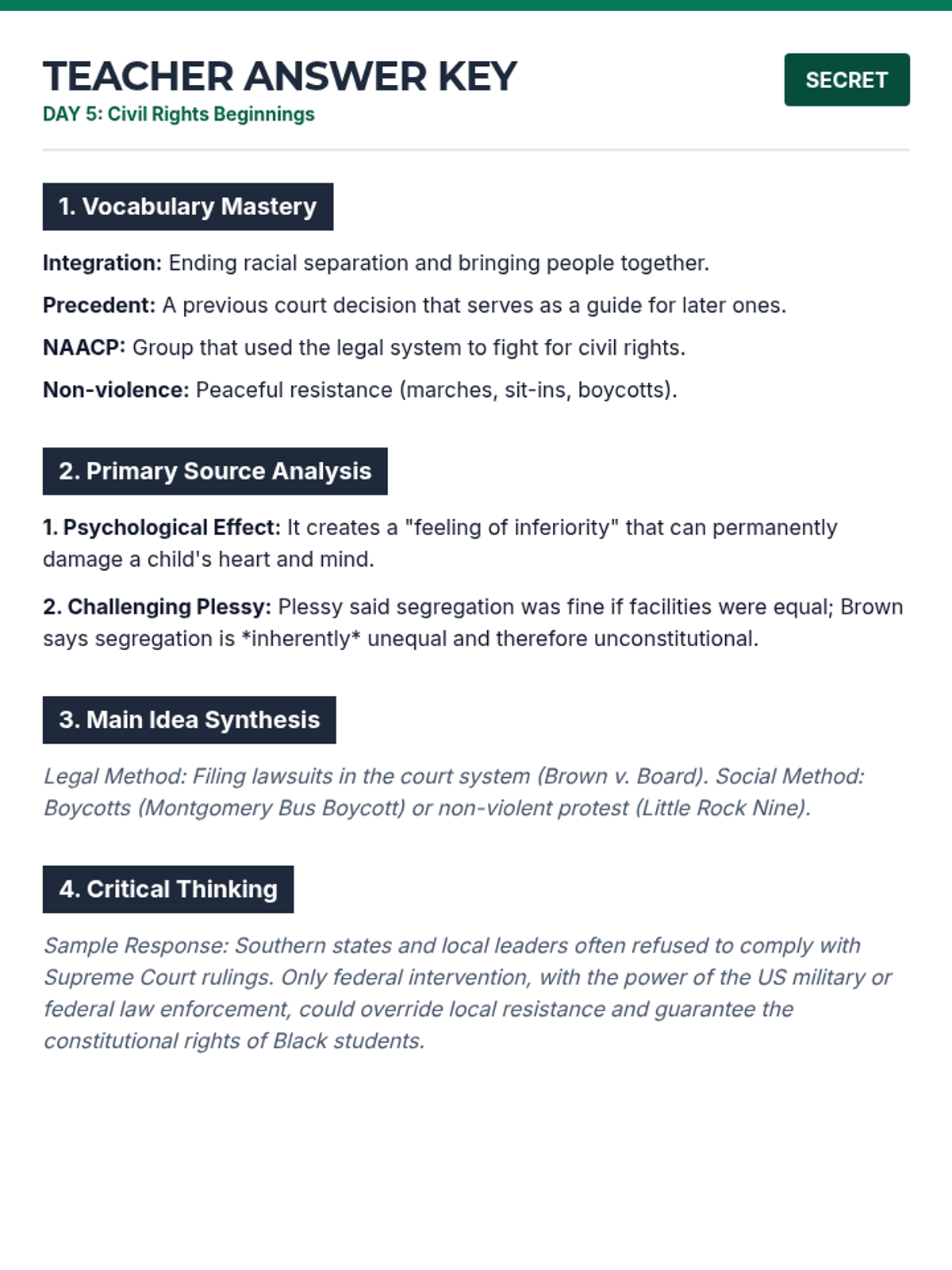 Teacher answer key for Day 5 remediation packet, including Brown v. Board analysis and civil rights strategies.
