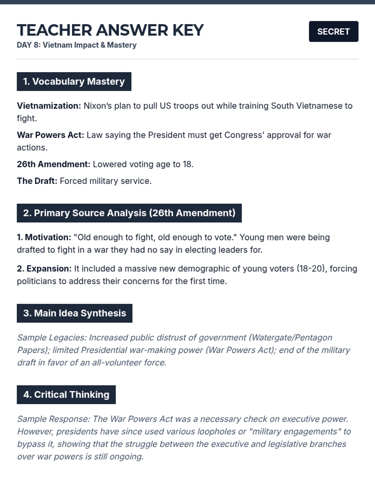 Teacher answer key for Day 8 remediation packet, focusing on the legacies of the Vietnam War and the 26th Amendment.