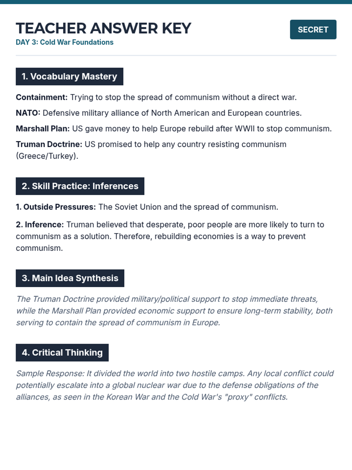 Teacher answer key for Day 3 remediation packet, covering Cold War containment, NATO, and the Marshall Plan with sample inference and critical thinking answers.