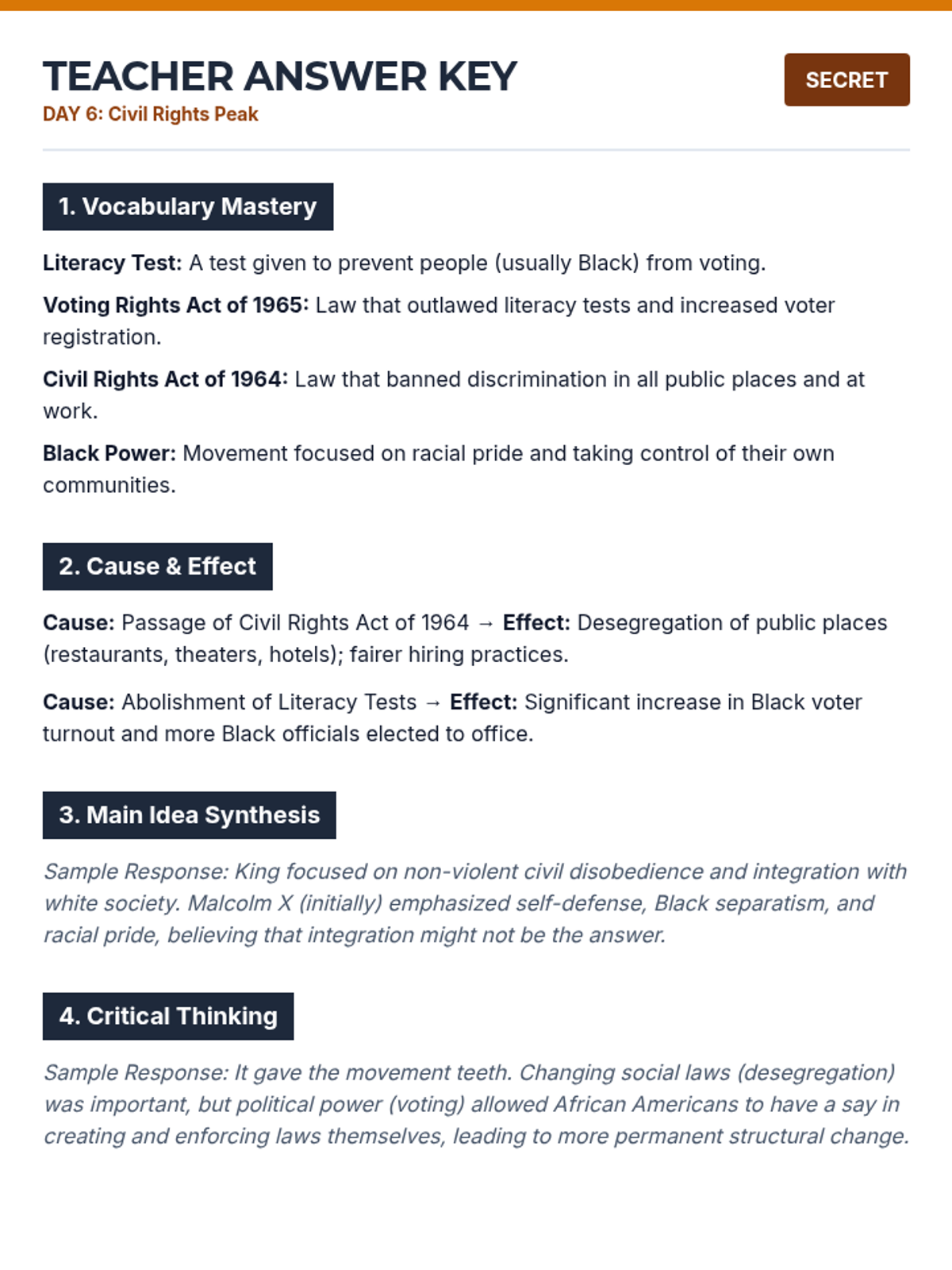 Teacher answer key for Day 6 remediation packet, covering Civil Rights legislation, MLK vs. Malcolm X, and cause-and-effect relationships.