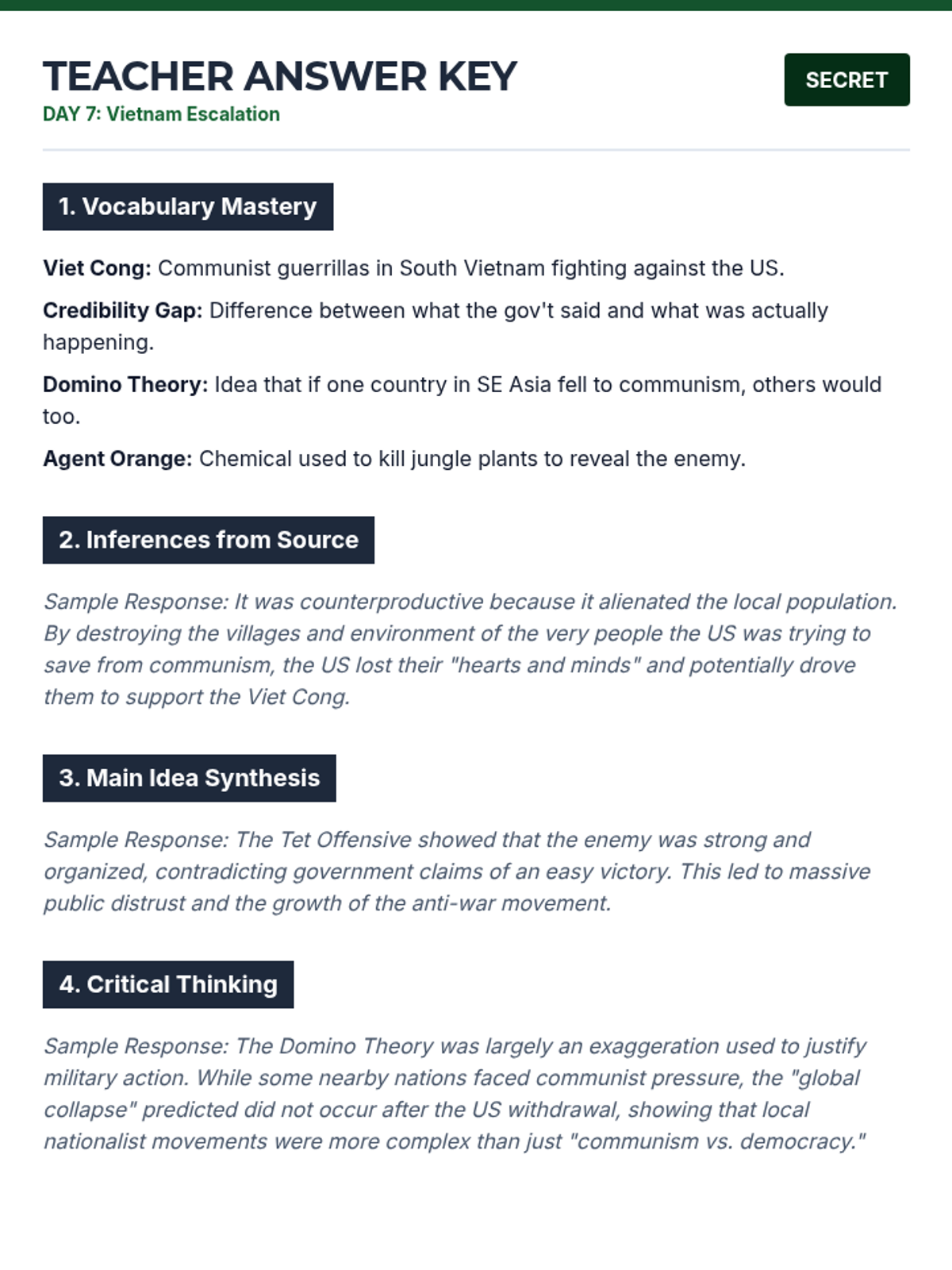 Teacher answer key for Day 7 remediation packet, including Domino Theory explanation, Viet Cong tactics, and sample inference responses.