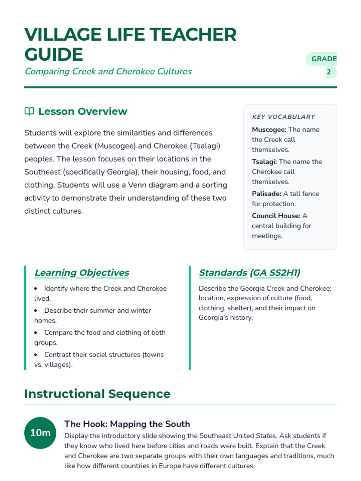 Detailed teacher guide for 2nd-grade Creek and Cherokee lesson, including standards, pacing, misconceptions, and differentiation.