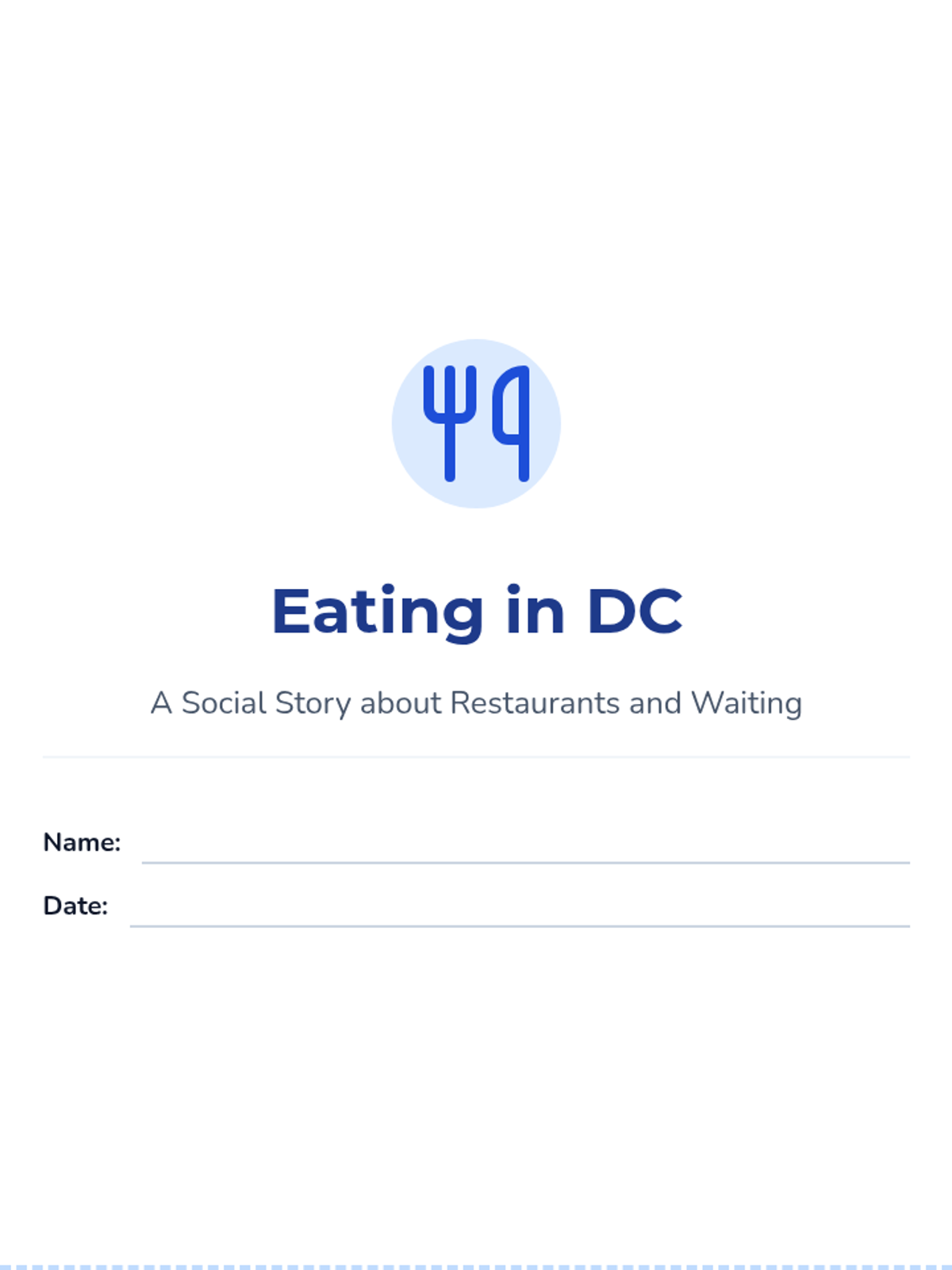 A social story booklet focusing on restaurant manners, patience while waiting for tables and food, and flexibility during the D.C. field trip.