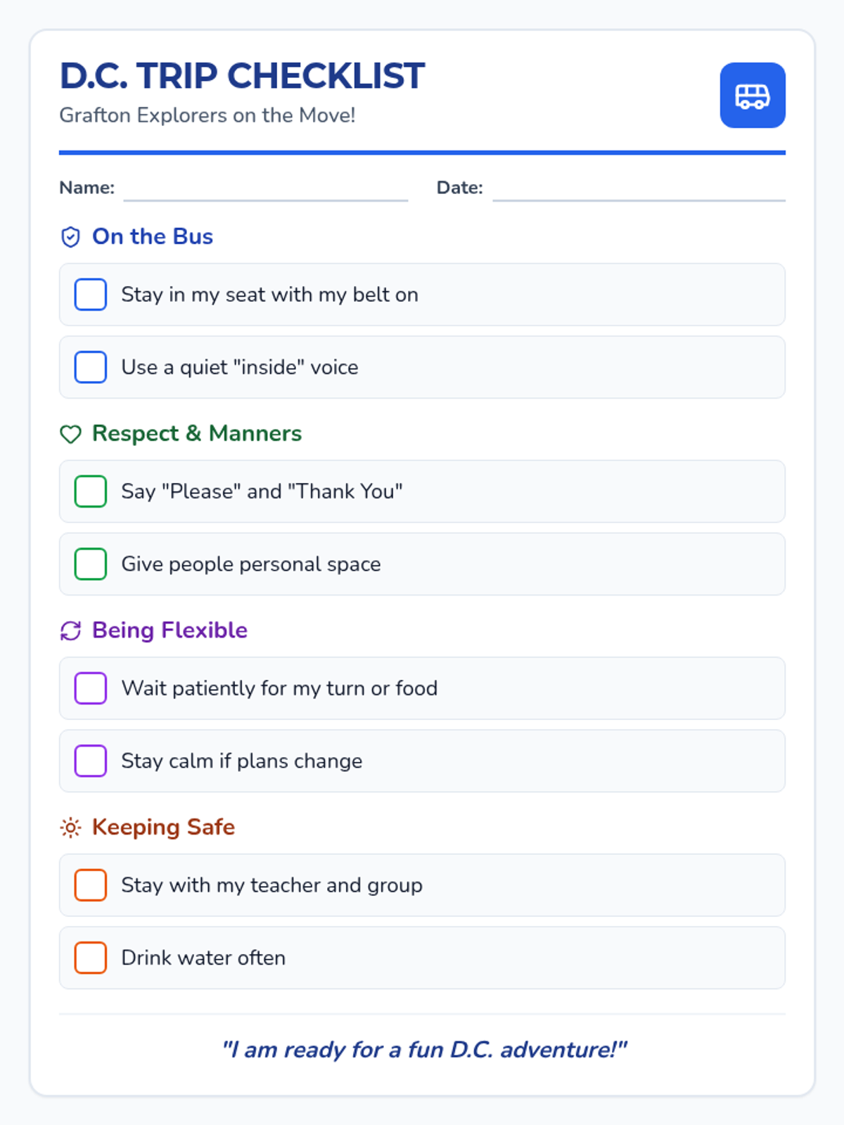 A single-page visual checklist for students to track appropriate behaviors including bus rules, manners, flexibility, and sun safety during their Washington, D.C. trip.