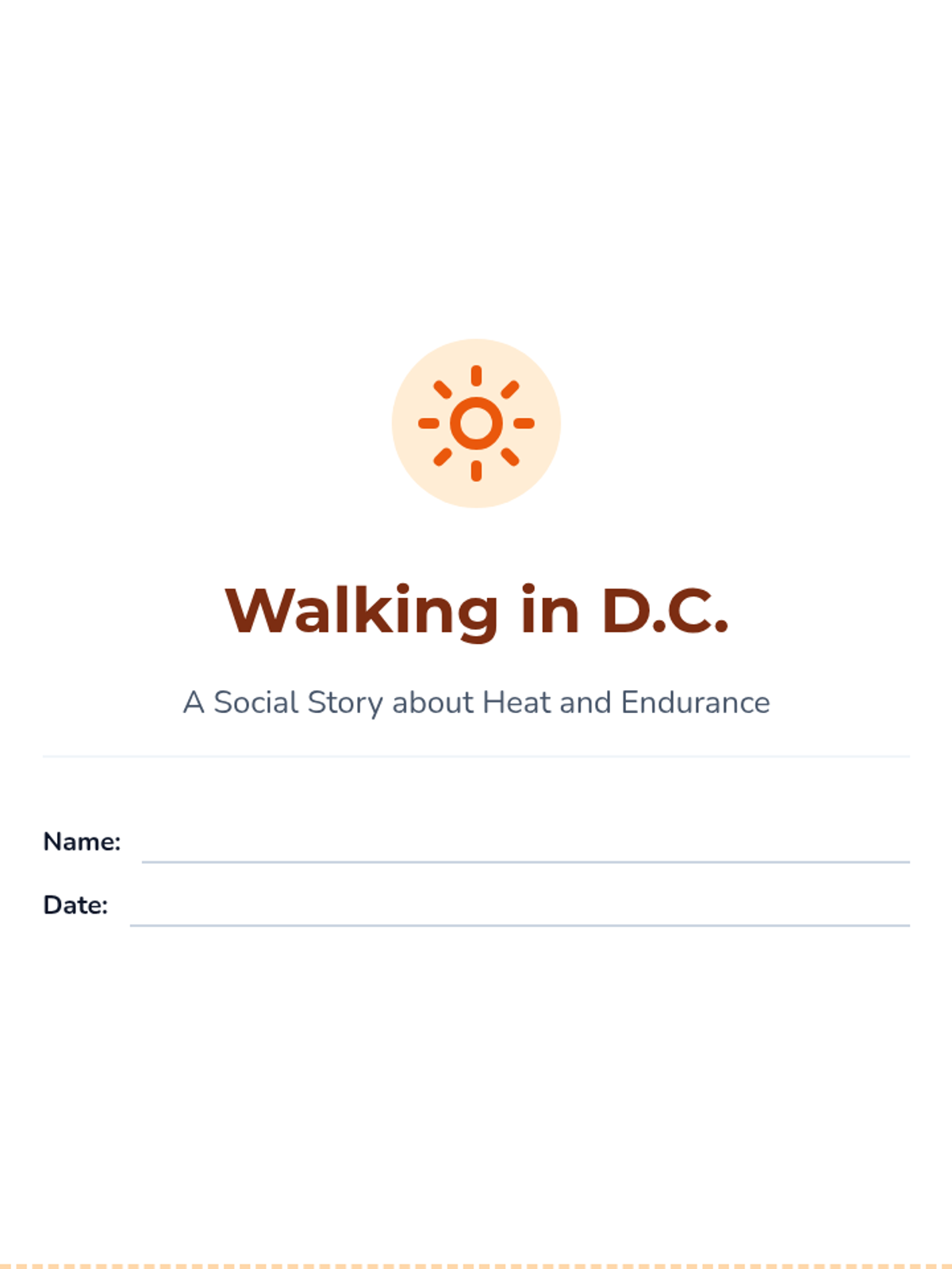A social story booklet addressing walking endurance, staying hydrated, wearing sun protection, and staying with the group during the hot D.C. field trip.