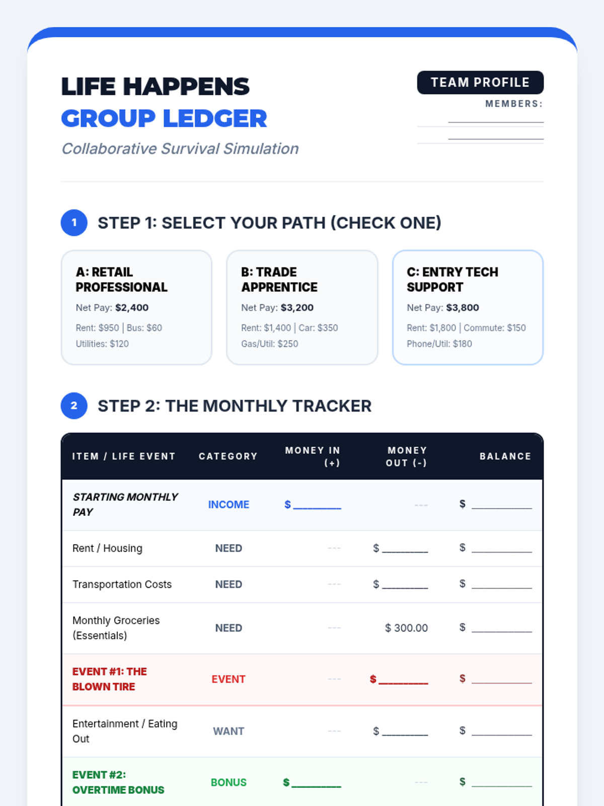 A collaborative group worksheet where students pick a career profile, track a month of income and expenses, and navigate unexpected 'Life Events' together using a structured ledger.