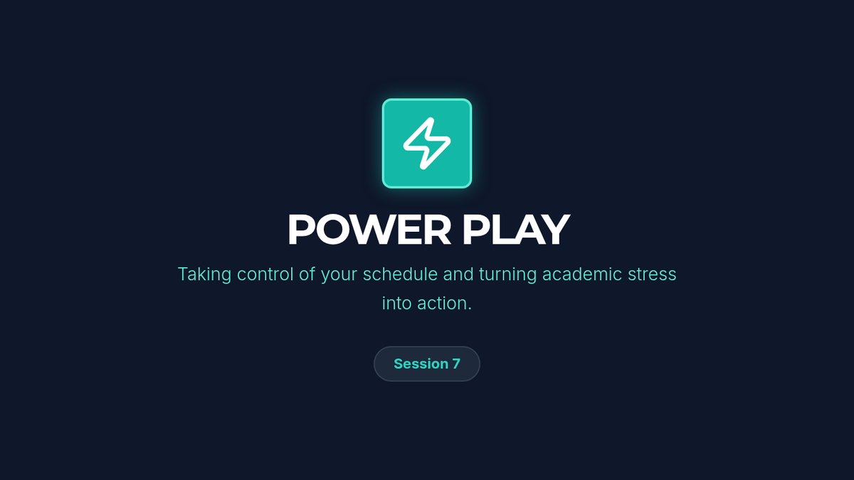 An instructional slide deck for Session 7, focusing on academic stress management, time-blocking, and overcoming procrastination. Fixed loop visualization and layout.