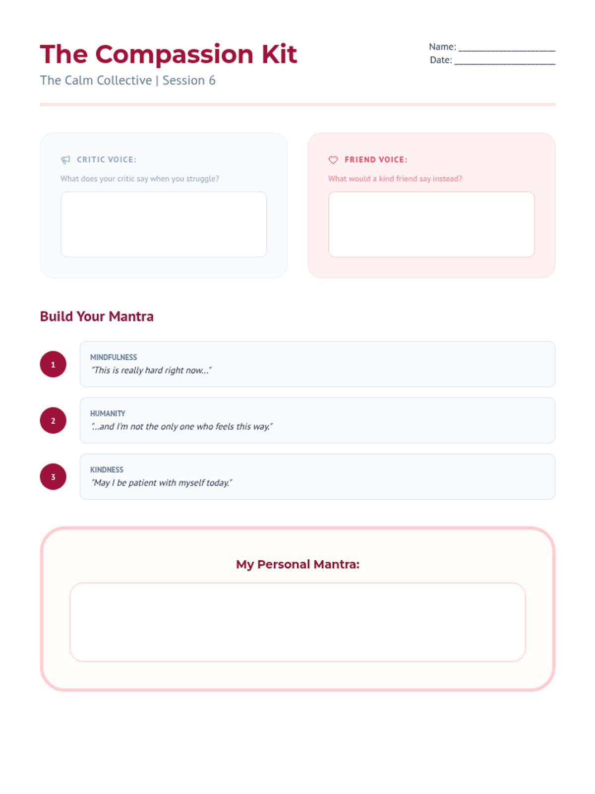 A self-reflection worksheet for countering the inner critic and developing a personalized self-compassion mantra. Fixed layout to fit on one page.