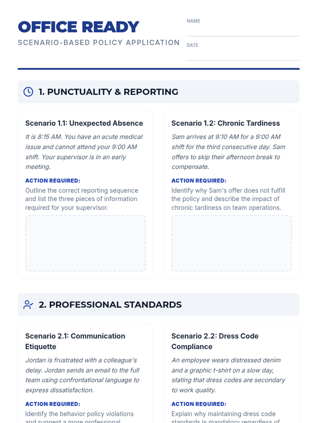 A scenario-based worksheet for trainees to apply workplace policies on attendance, behavior, and safety. Revised with more professional language and expanded dress code questions. Layout optimized to fit 2 pages.