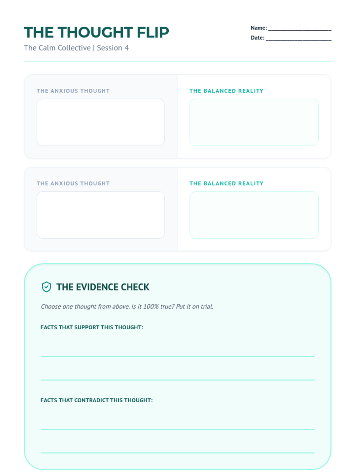 A student worksheet for identifying and reframing anxious thoughts using a "Thought Flip" technique and an "Evidence Check" exercise. Fixed page breaks and legibility.