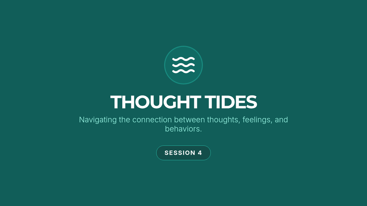 An instructional slide deck for Session 4, explaining the connection between thoughts, feelings, and behaviors, identifying "thought traps," and introducing cognitive reframing. Fixed the CBT loop and added depth.