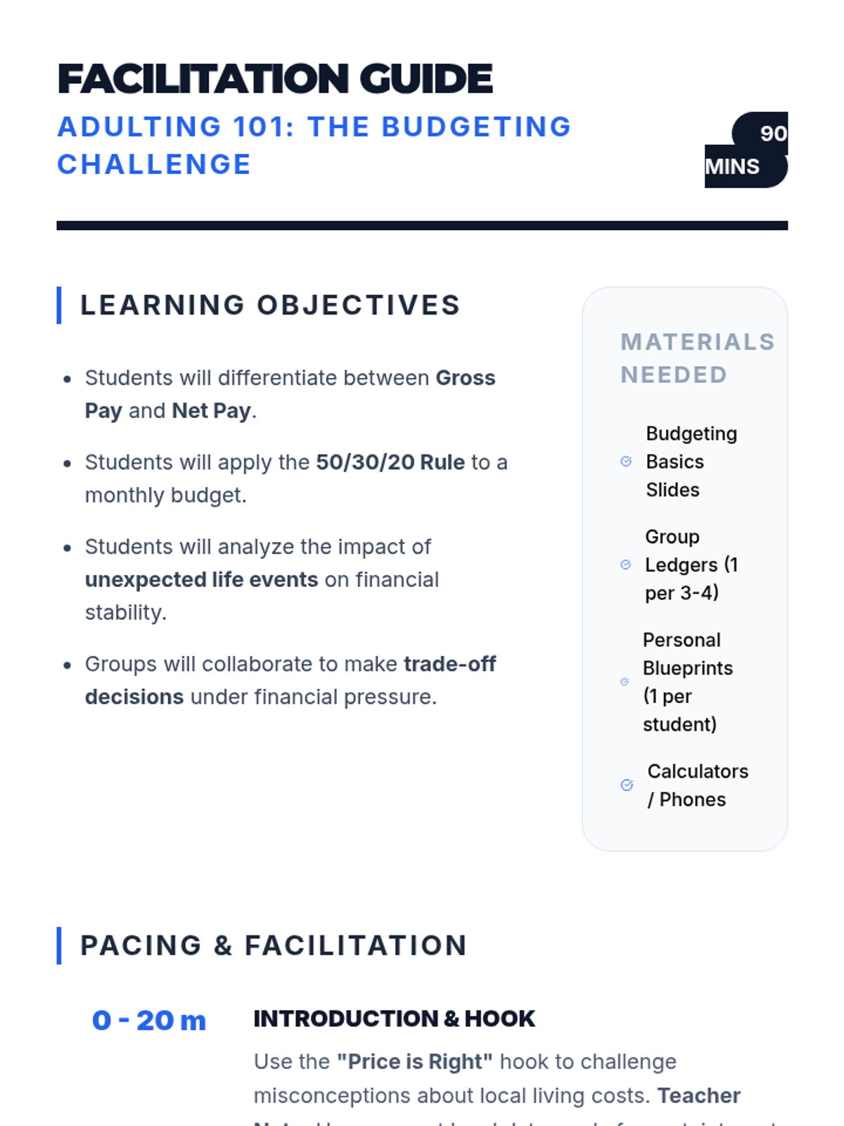 A facilitation guide for teachers to manage the 90-minute Adulting 101 workshop, including pacing, learning objectives, and simulation keys.