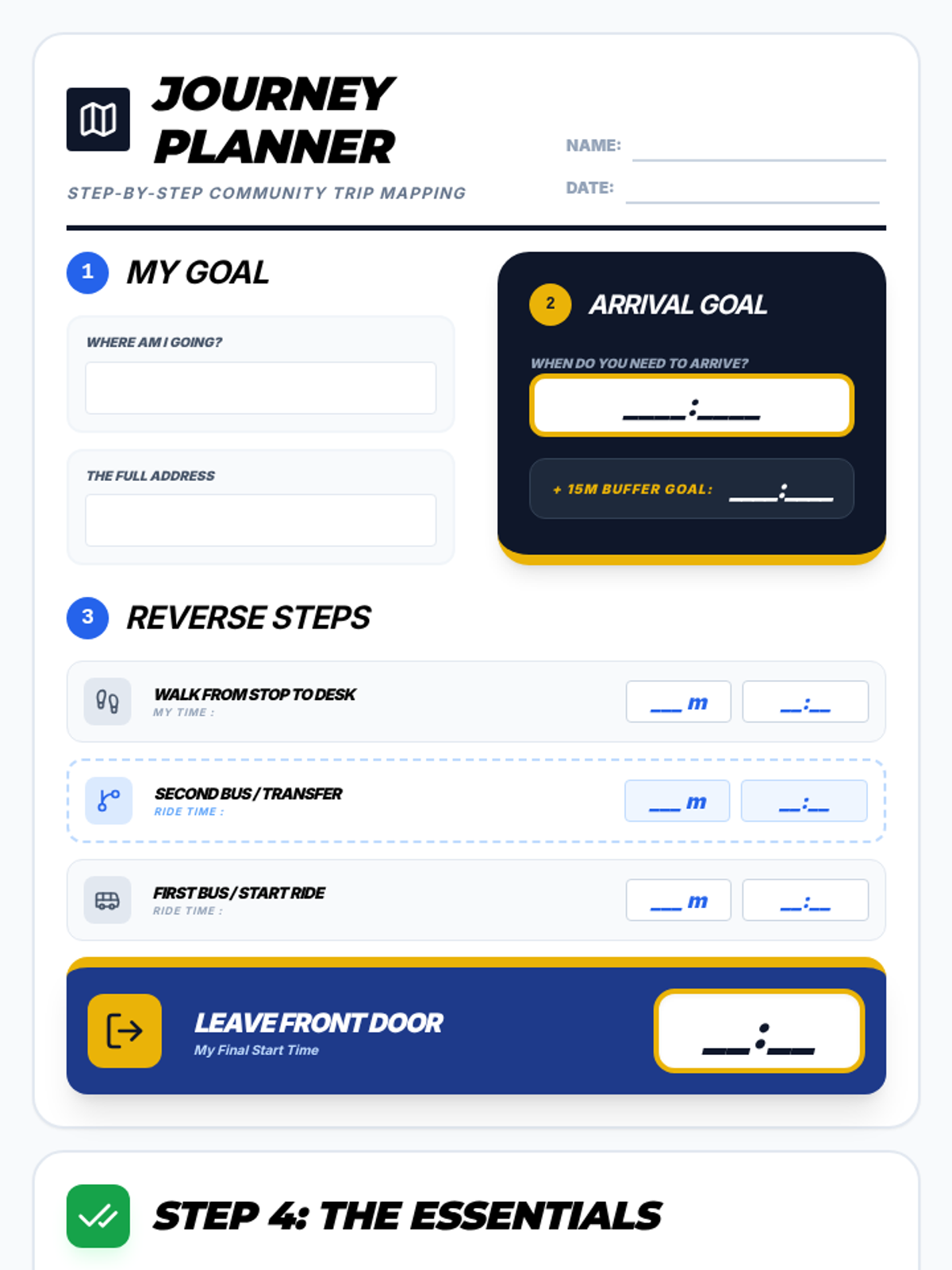 A step-by-step journey planning worksheet for community destinations, utilizing "Reverse Planning" and the "Buffer Time Rule" for adults with IDD.