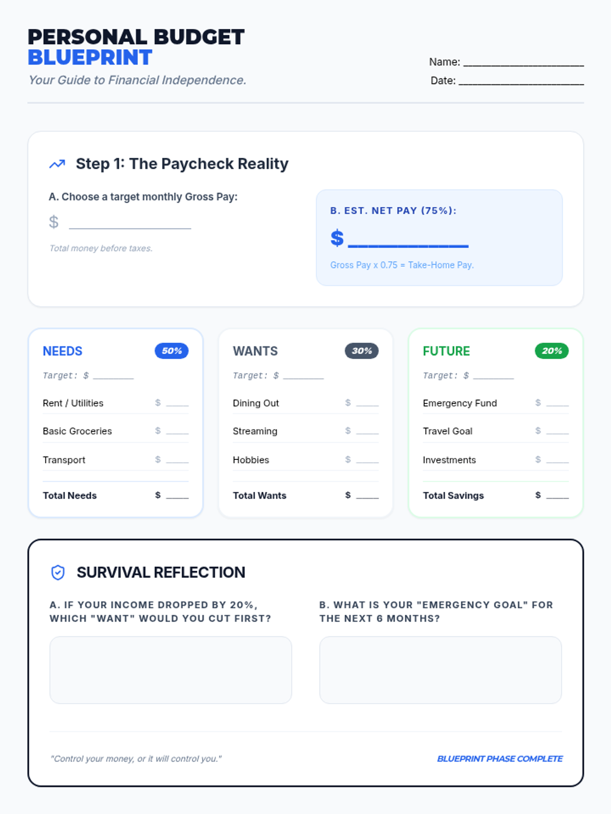 A personal budgeting blueprint where students apply the 50/30/20 rule to a target income, calculating net pay and allocating funds for needs, wants, and savings.