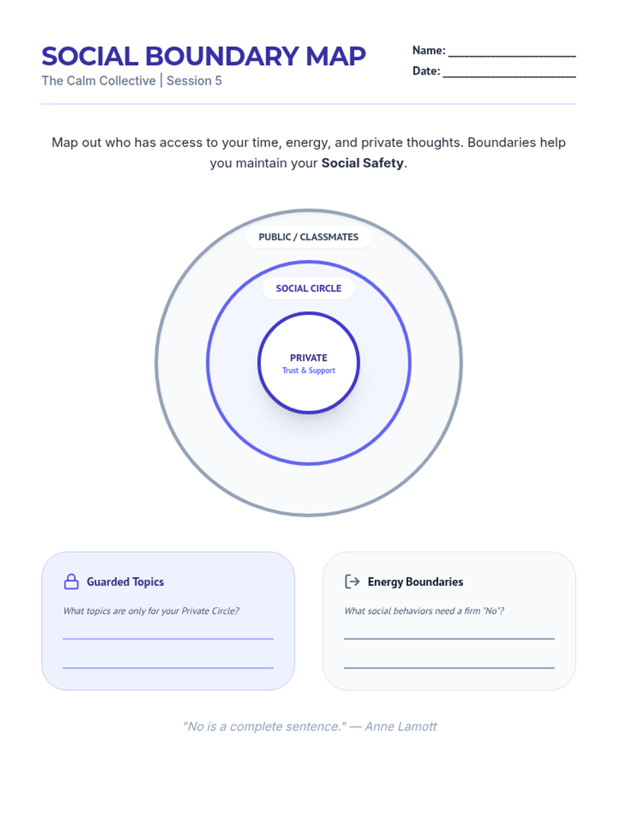 A visual boundary mapping worksheet for students to identify their core support circle and establish healthy social boundaries. Fixed page breaks and contrast.