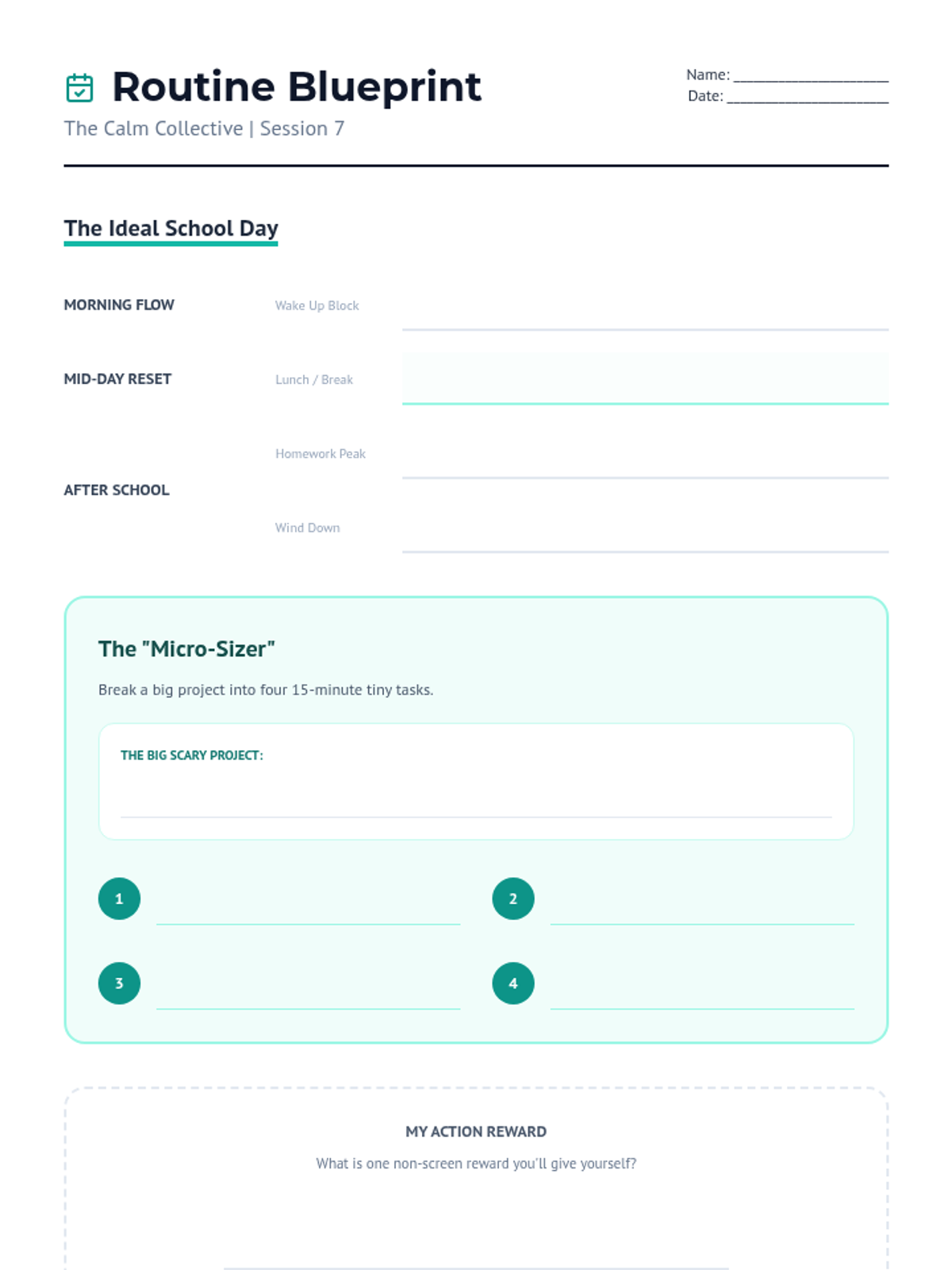 A student planning worksheet for time-blocking a balanced school day and breaking down large academic projects into manageable "Micro-Tasks." Fixed layout, legibility, and page breaks.