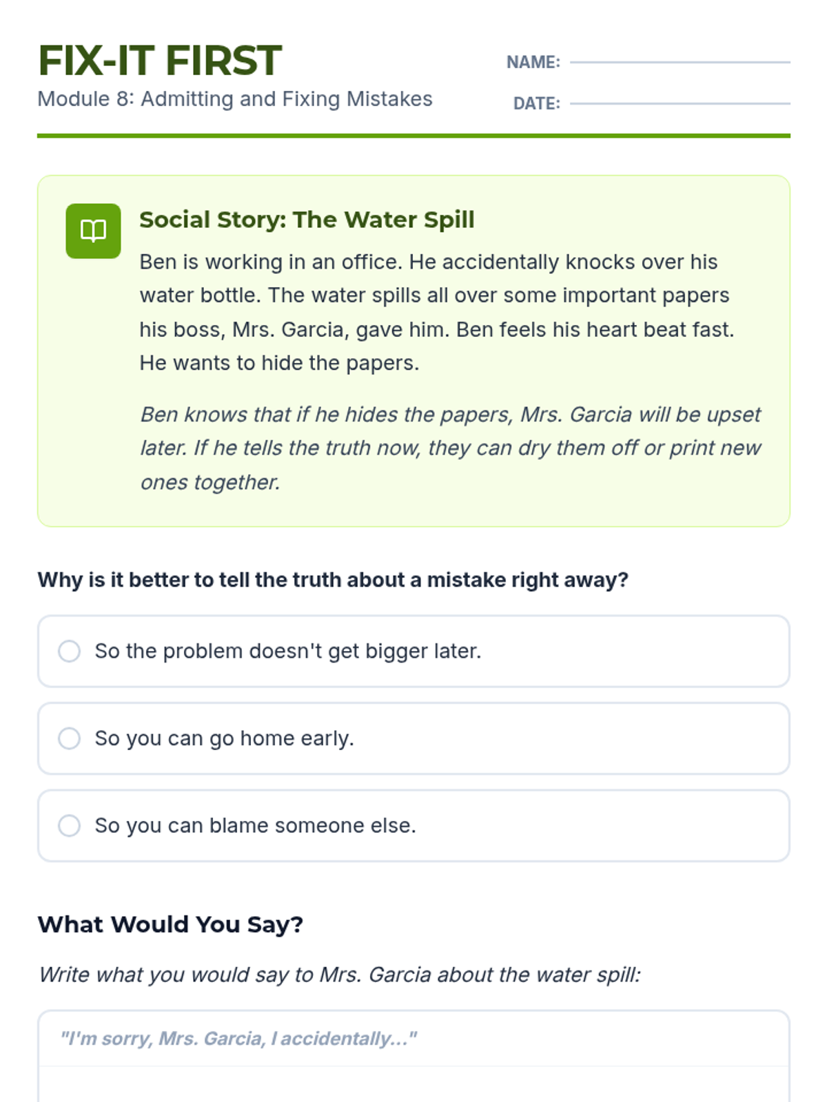 A worksheet for honestly admitting workplace mistakes. Revised with social story, checklist, and fixed page breaks.