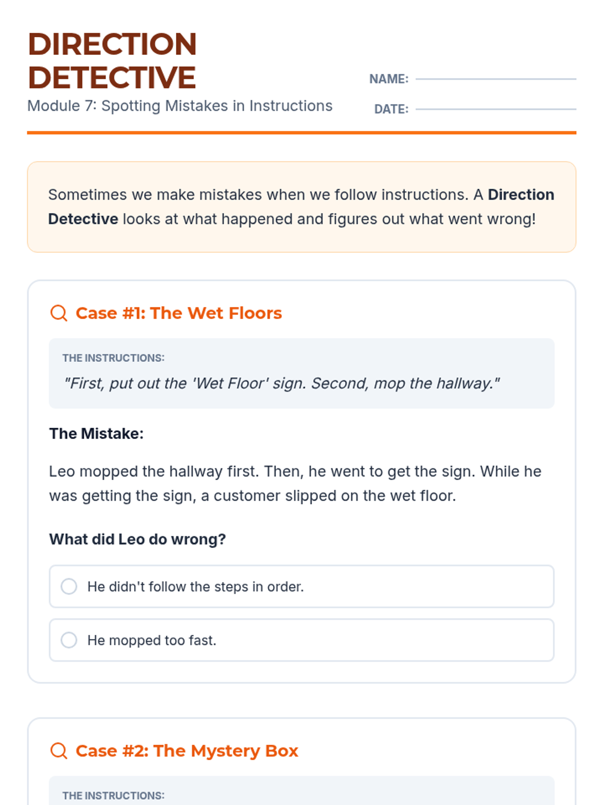 An analytical worksheet for spotting errors in following instructions. Revised for uniform answer styling and improved header layout.