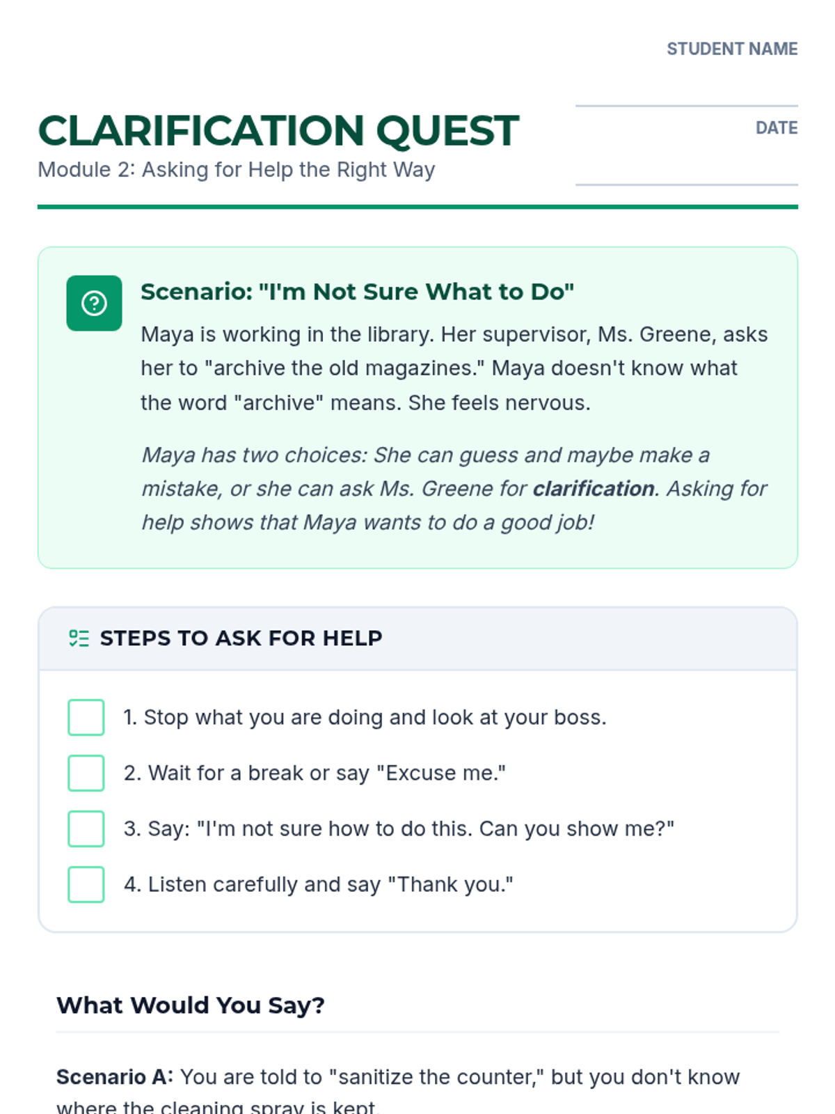A worksheet focused on asking for clarification, featuring a step-by-step checklist, social story, larger lined writing prompts, and multiple-choice questions. Revised with True/False section and fixed page breaks.