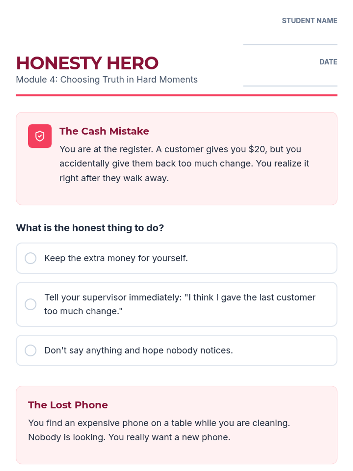 A worksheet presenting scenarios about handling extra change and found items to practice workplace honesty. Revised for better page breaks and larger writing areas.