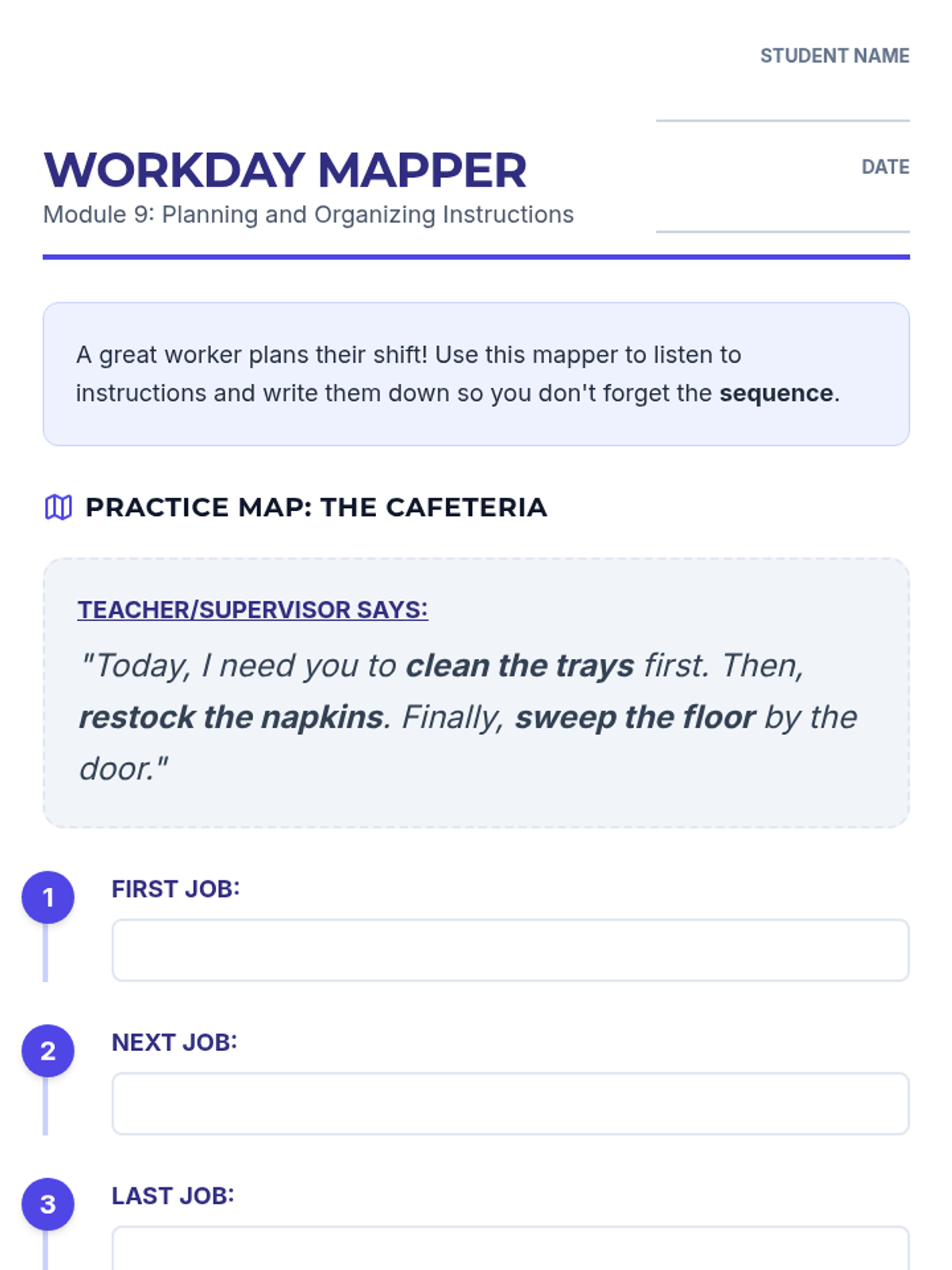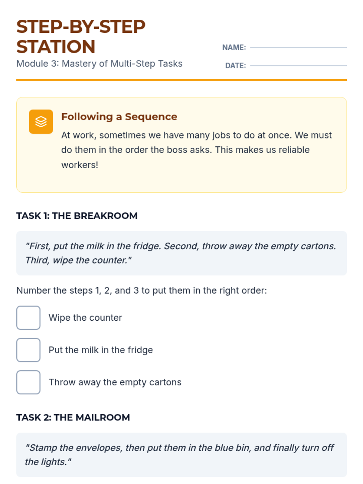 A worksheet focused on following multi-step instructions and sequencing tasks in common workplace settings. Revised for better page breaks and includes more scenarios.