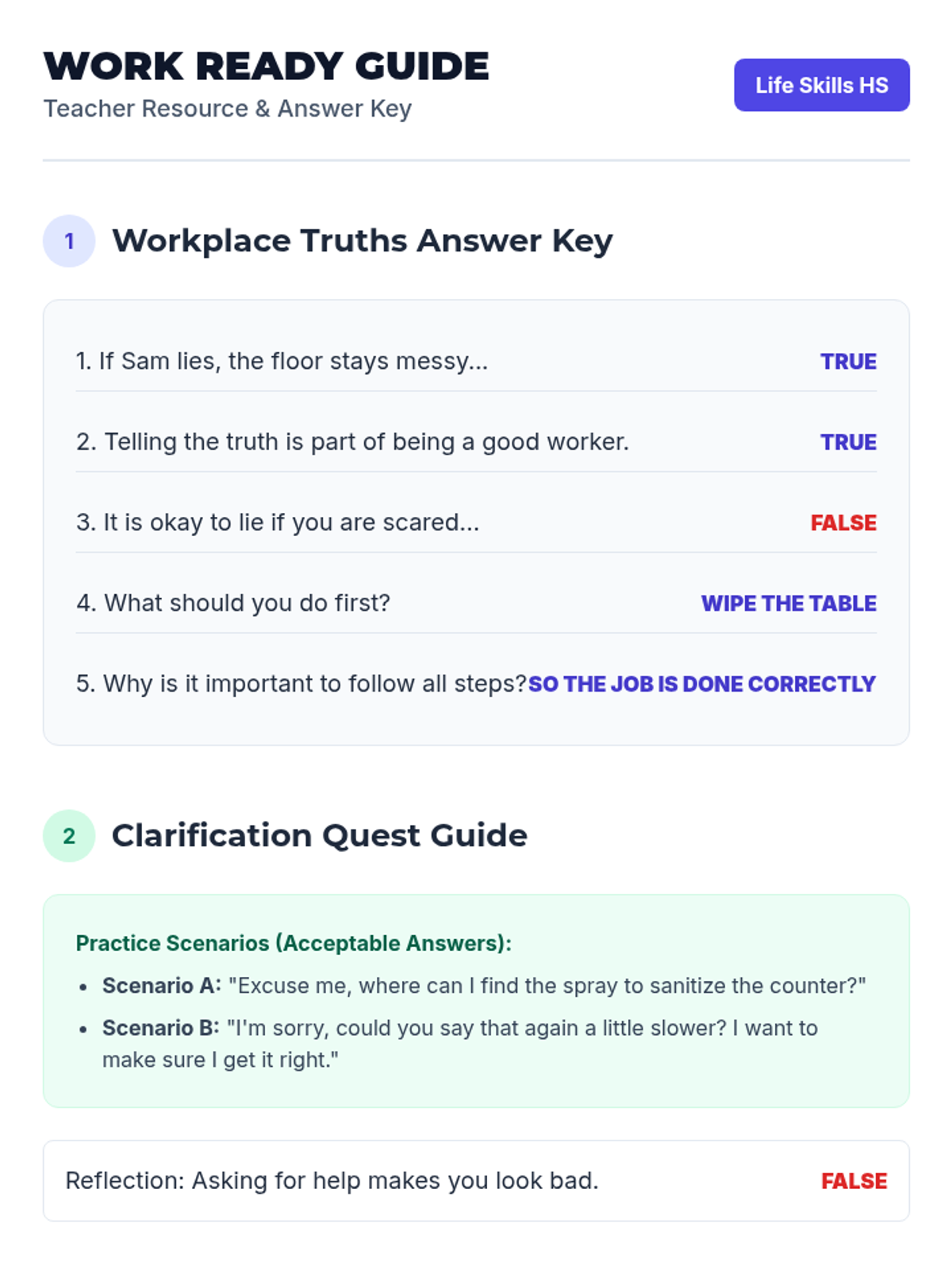 A comprehensive teacher resource containing the answer keys and teacher tips for all 10 workplace readiness worksheets.