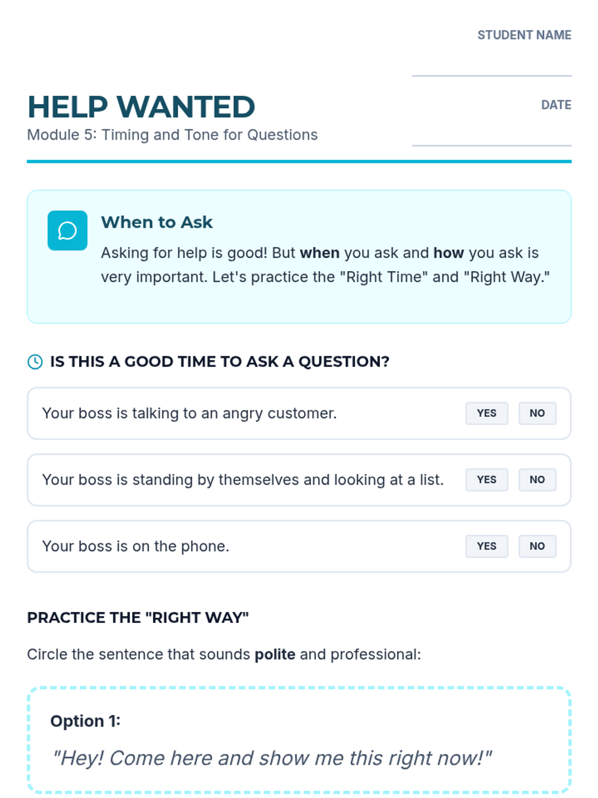 A worksheet focused on the timing and tone of asking for workplace clarification. Revised for better button sizing, uniform answer choices, and page flow.