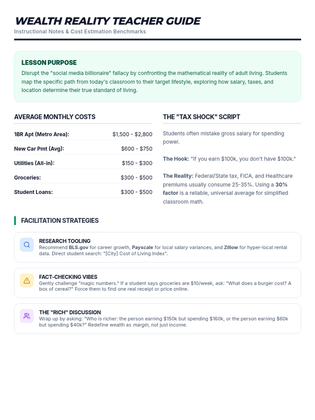 A teacher facilitation guide containing cost benchmarks, research resources, and instructional tips for delivering the 'Fortune Blueprint' lesson.