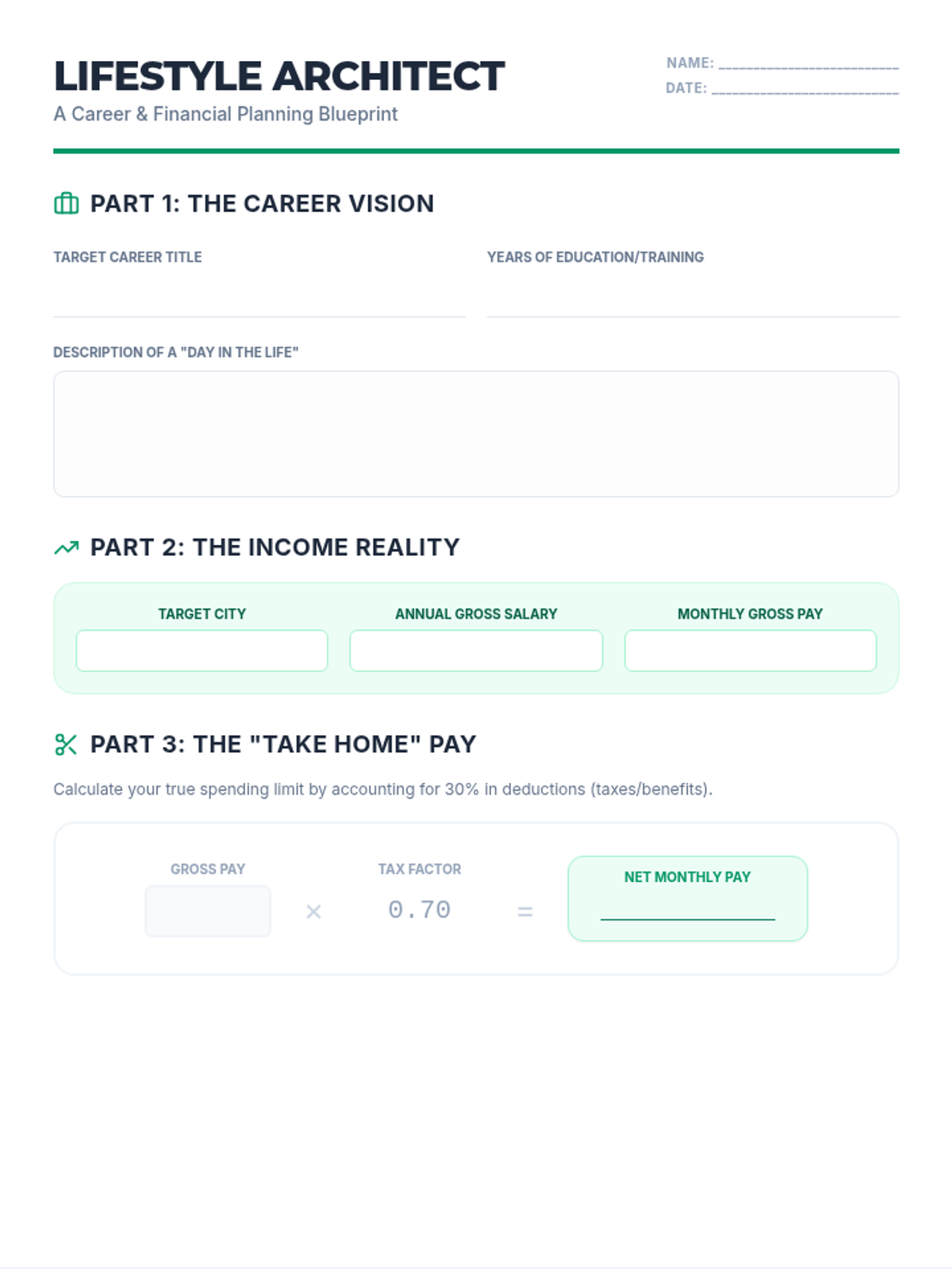 A comprehensive lifestyle research packet for students to map out their future career, research specific regional salaries, calculate net pay after taxes, and budget for major adult expenses.