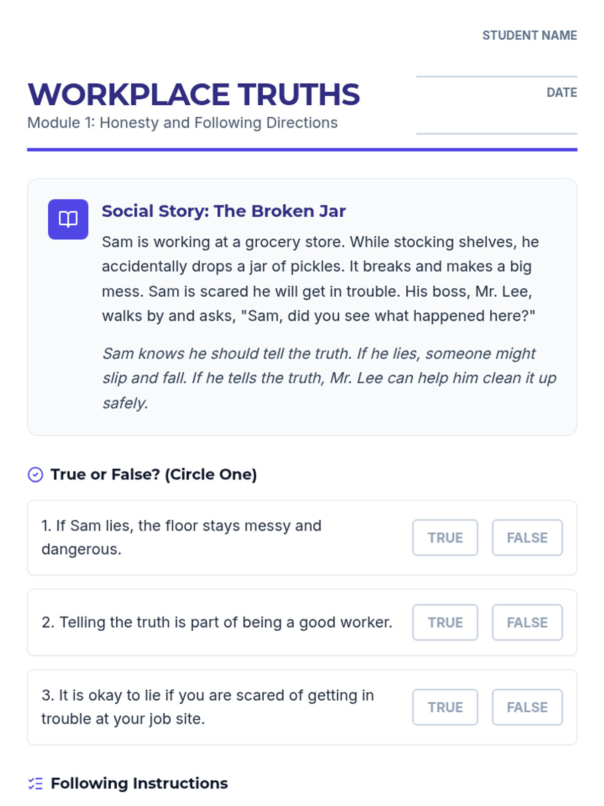 A worksheet focusing on honesty and following multi-step instructions through social stories, true/false, and multiple-choice questions. Revised with improved alignment and a self-monitoring checklist.