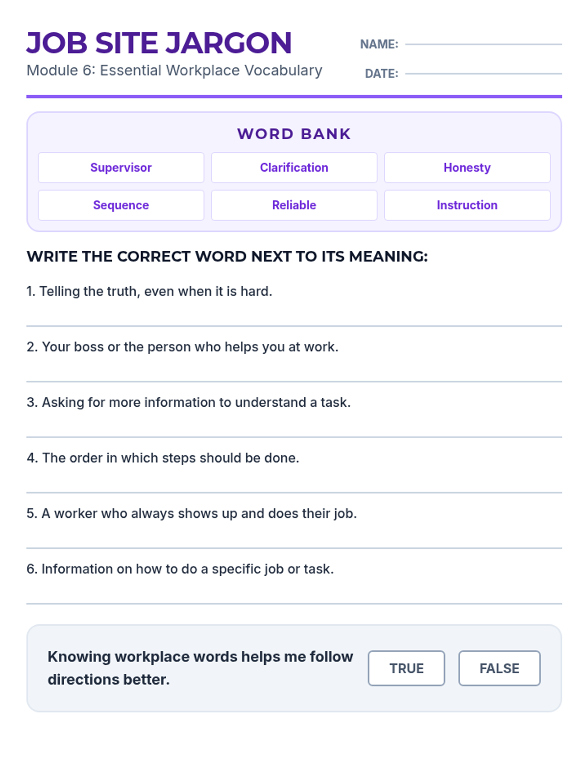 A vocabulary-focused worksheet that defines essential workplace terms. Revised for single-page fit, white writing lines, and completeness.