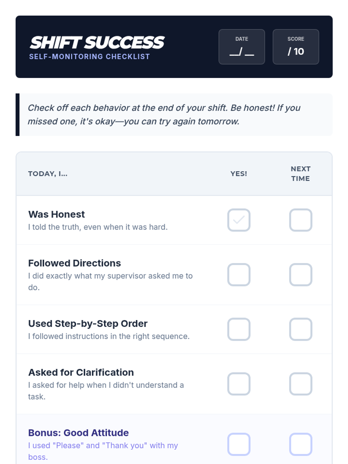 A self-monitoring checklist for students to use daily at their job site. Revised for single-page layout, lined reflection box, and correct score.